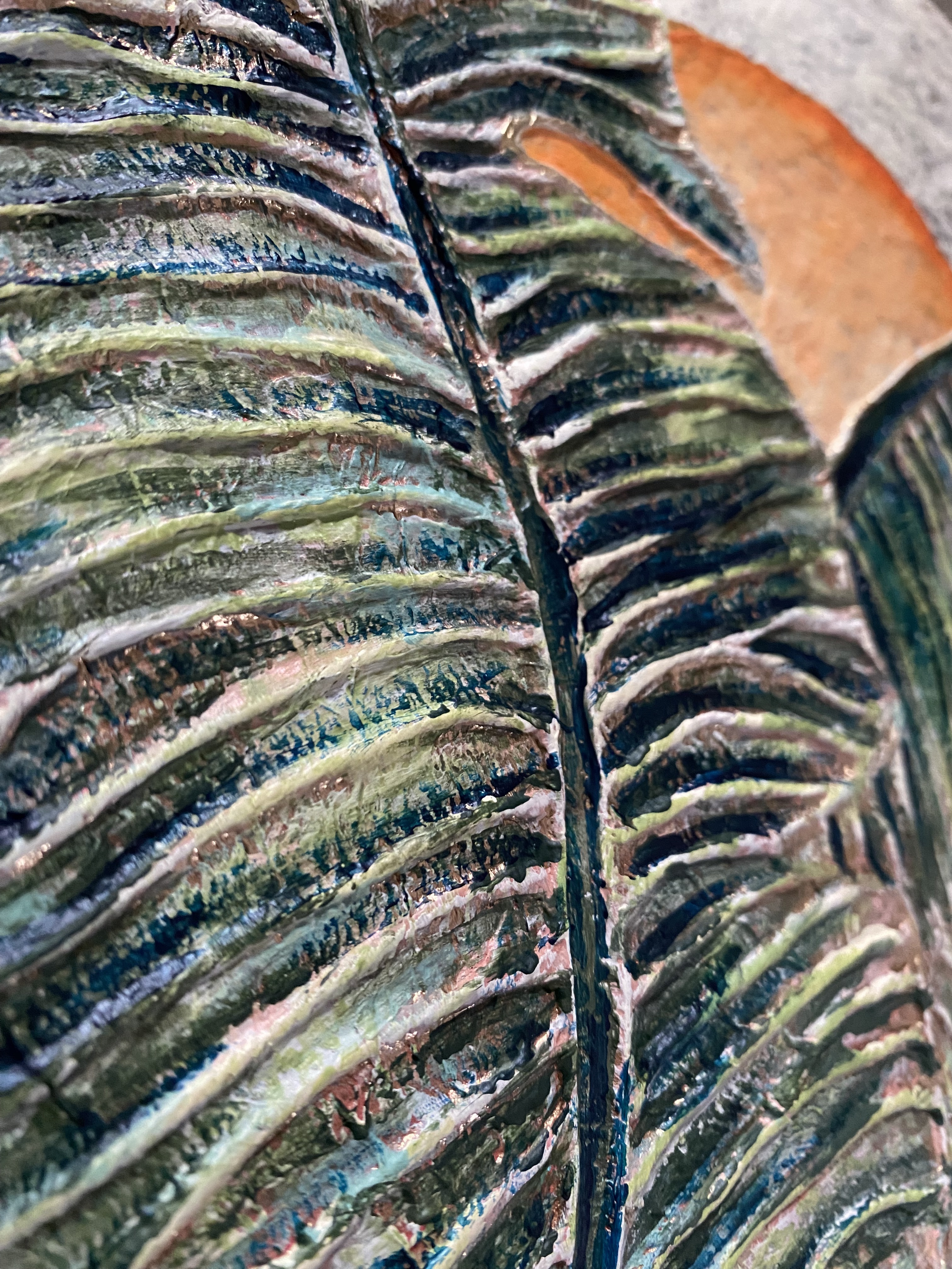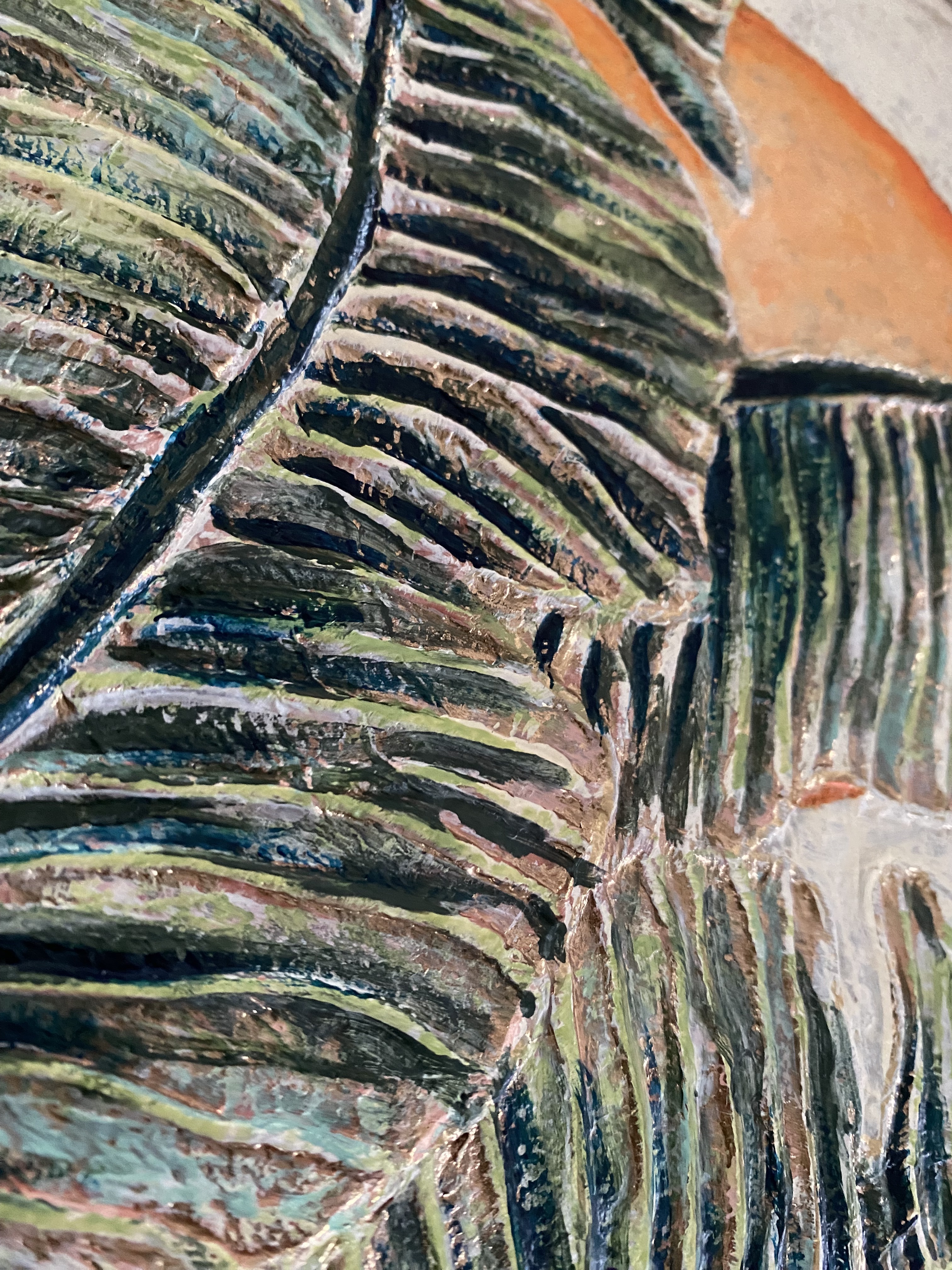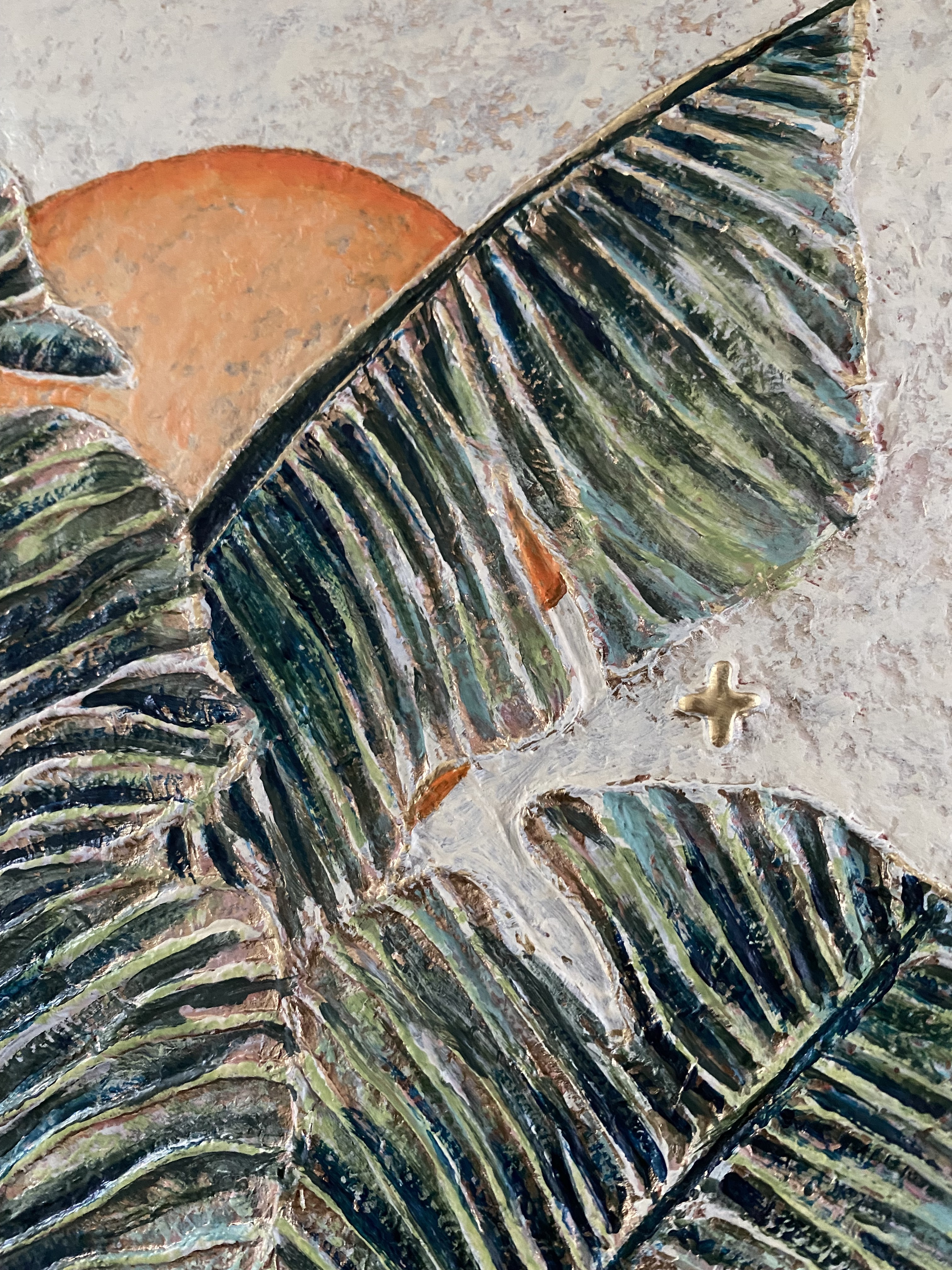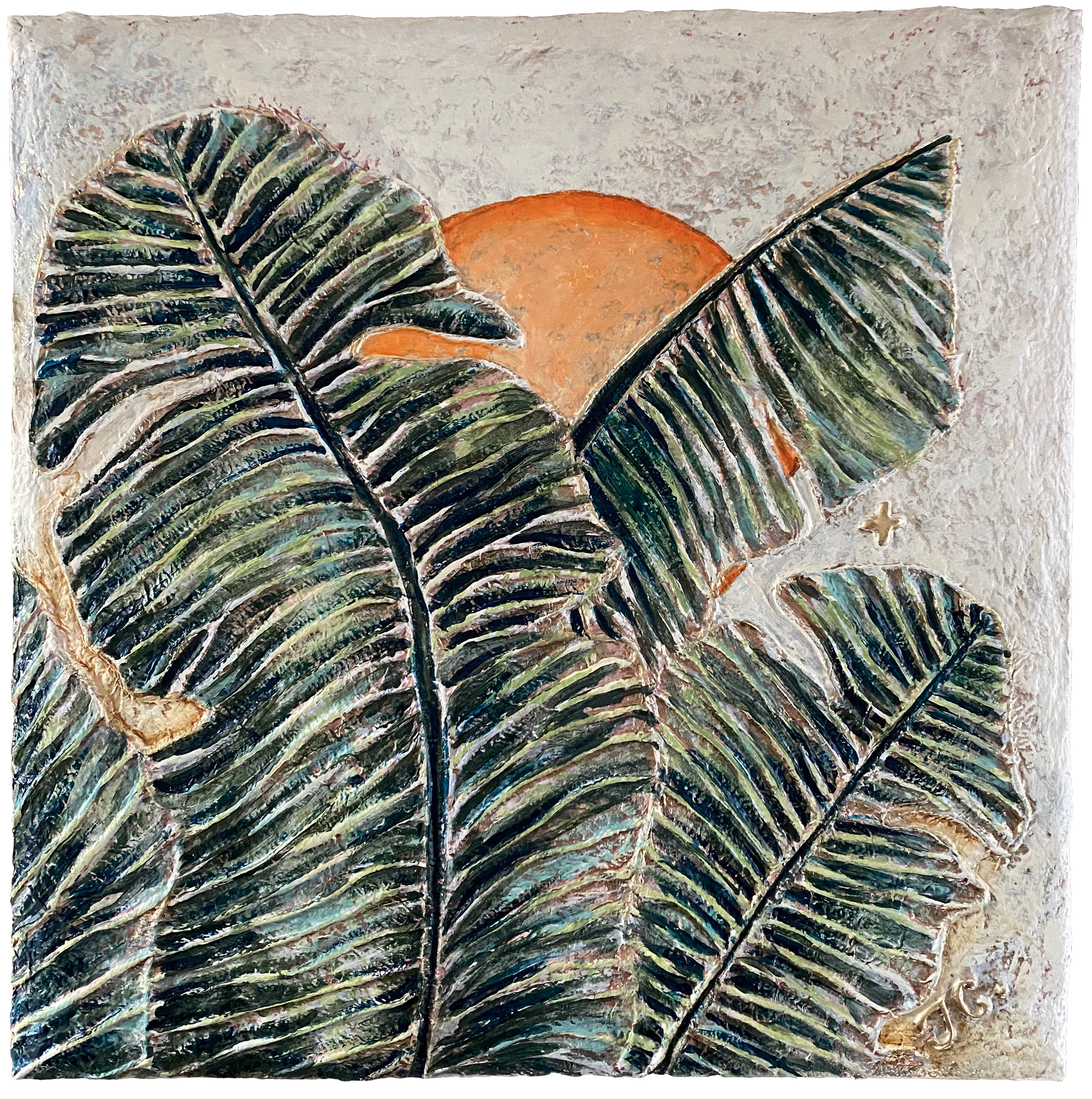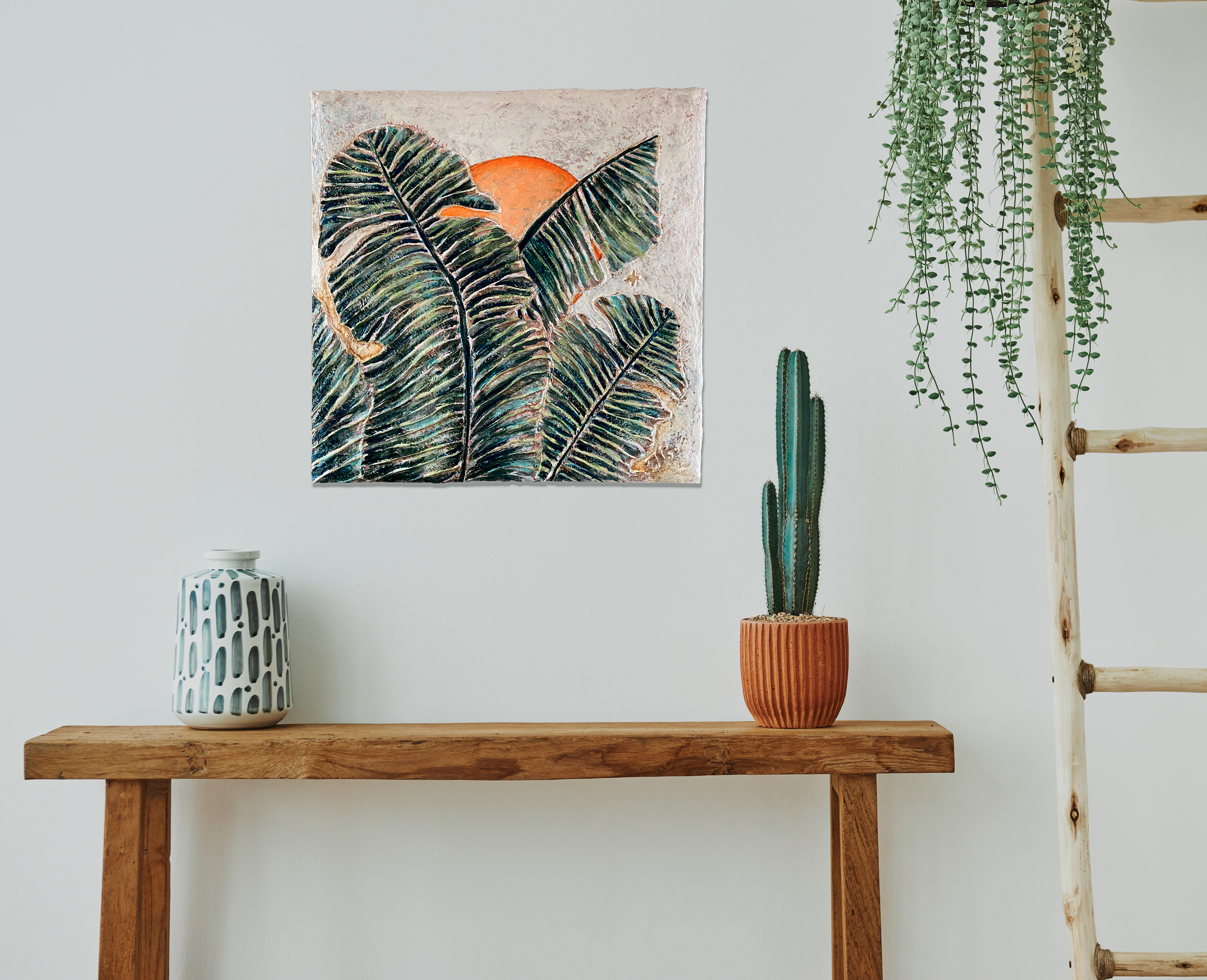 Cette pièce unique de 2025 travaille le mouvement et la profondeur à travers un bas-relief délicat. L’utilisation de la ficelle marouflée crée une vibration organique dans les feuilles, simulant le souffle d’un vent tropical. Les teintes de beige et de vert profond sont réveillées par un orange solaire et des éclats d’encre dorée. Le Tableau « Chaleur exotique du soleil couchant » capte la lumière naturelle pour transformer l’œuvre au fil de la journée.