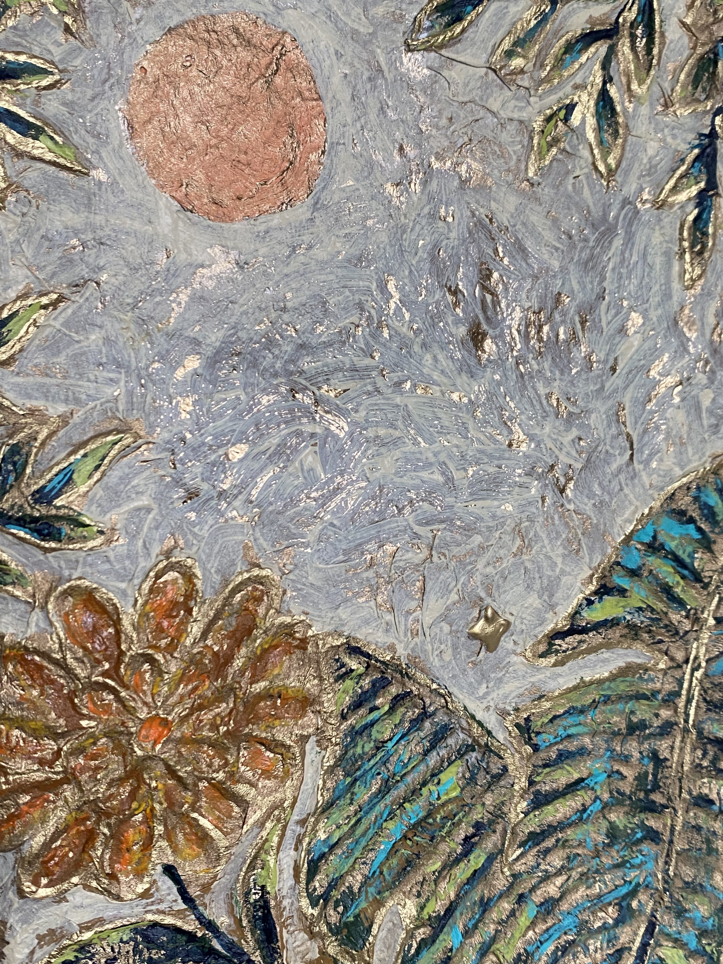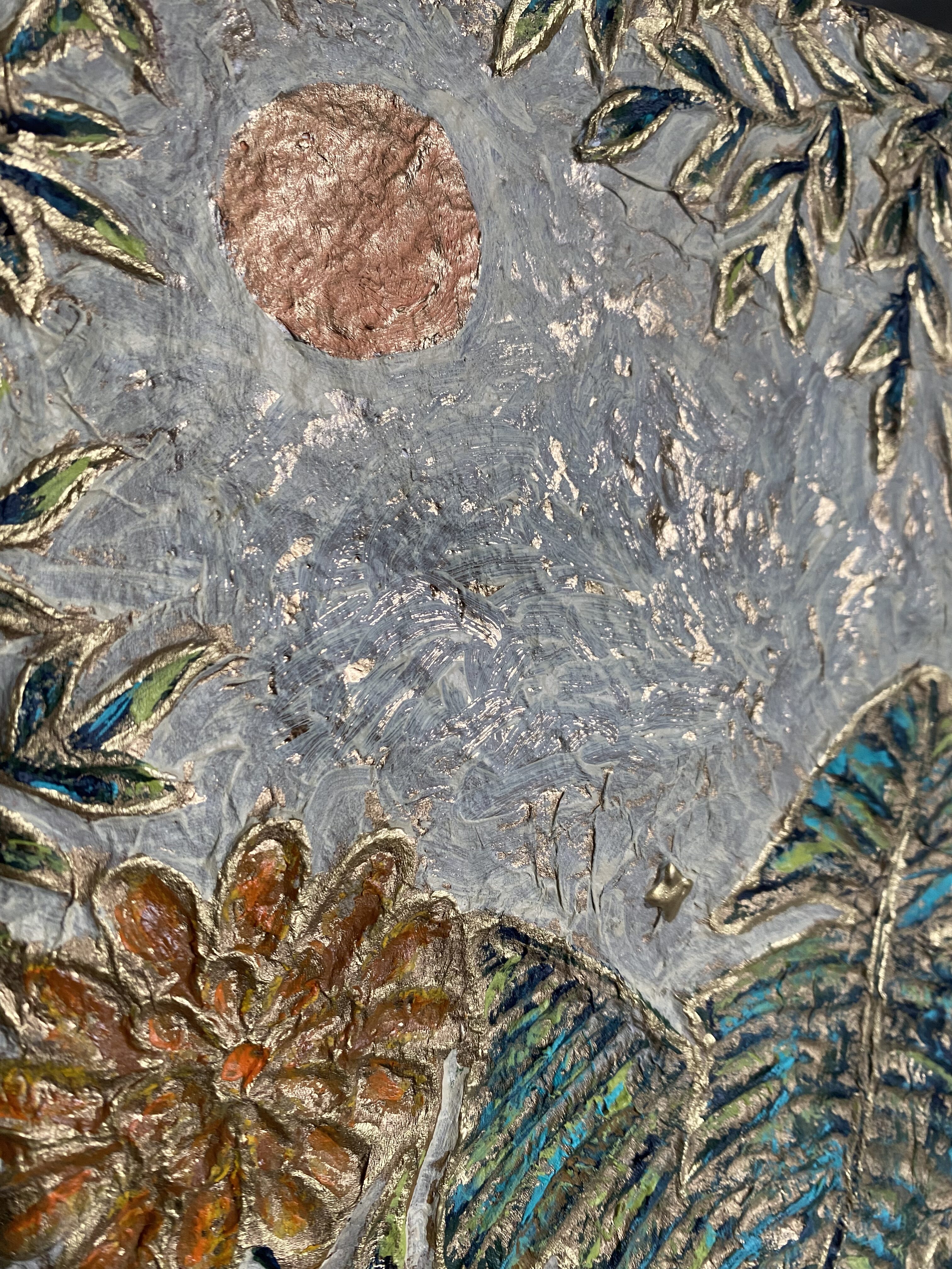 Technique : Techniques mixtes sur bois, pâte à papier, ficelle marouflée, peinture acrylique, pastel à l’huile, dorures.