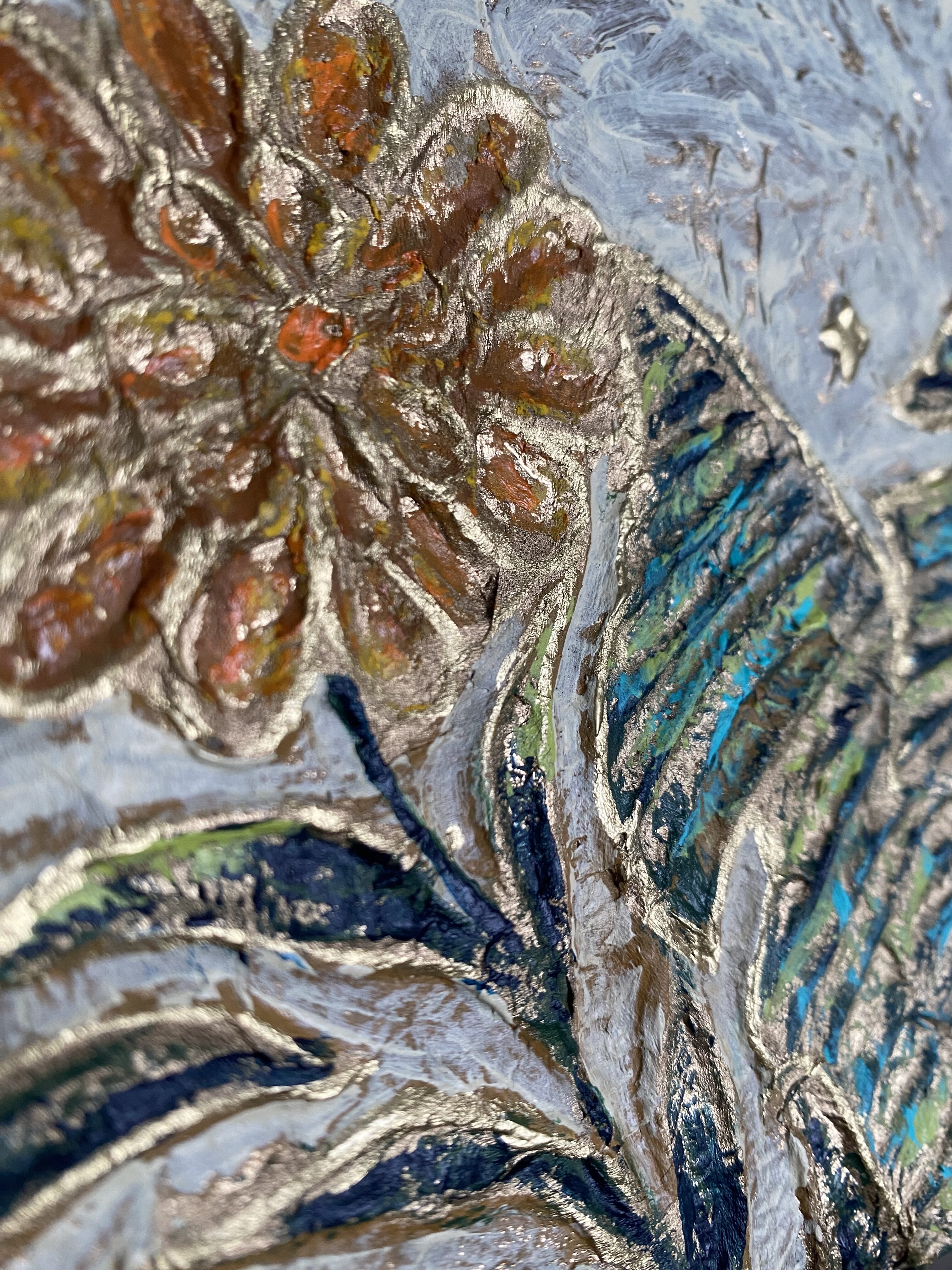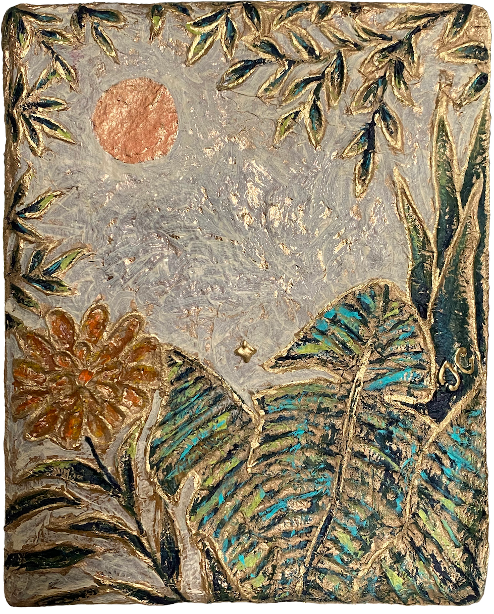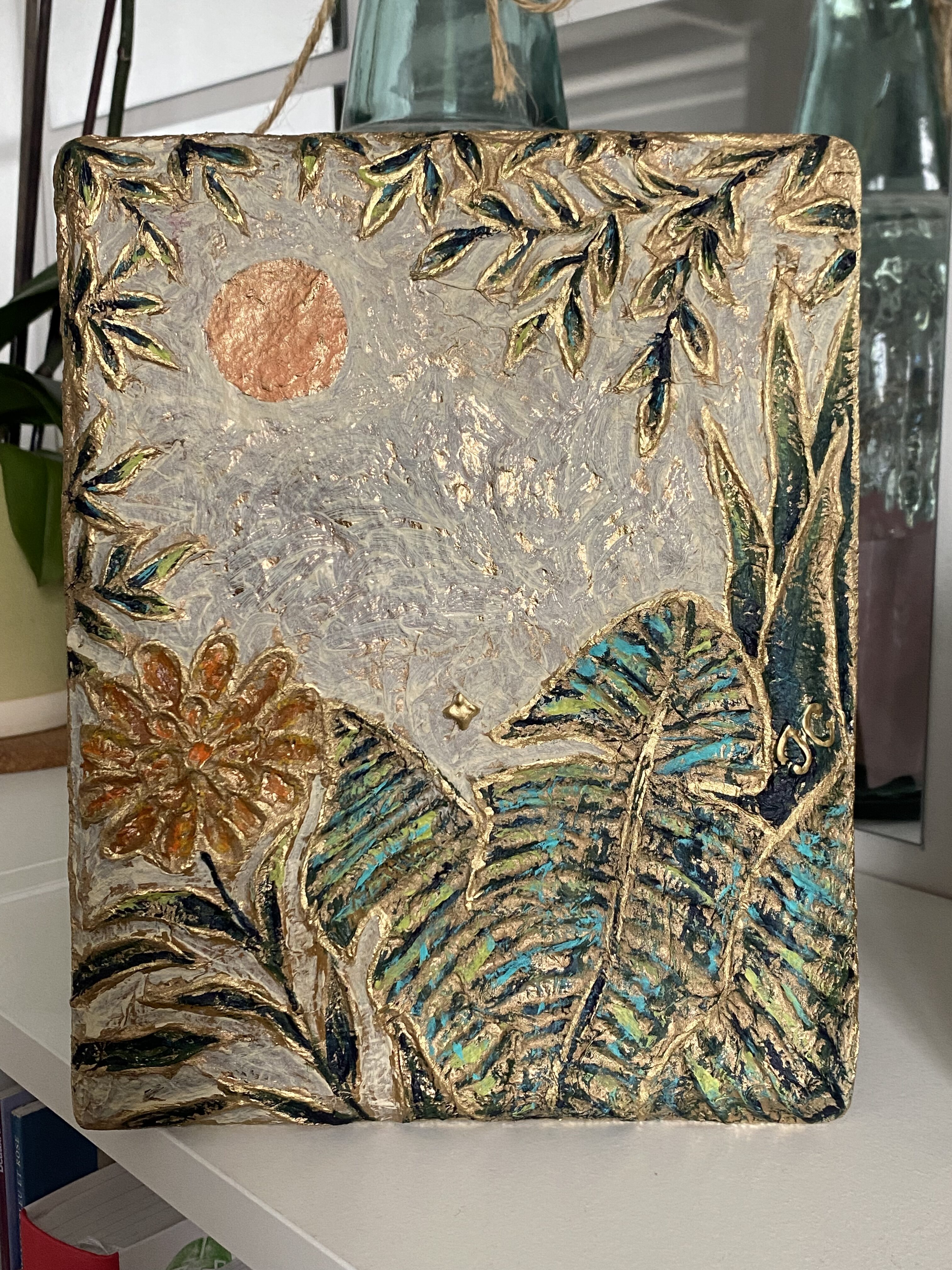 Réalisé sur un support bois de 23,5 x 19 cm, le Tableau « En lisière de forêt » mise sur un relief plutôt dense. La pâte à papier et la ficelle marouflée structurent chaque détail végétal, créant un jeu d’ombres propre au bas-relief. Les touches turquoise et vertes se mélangent aux dorures pour capter la lumière, tandis que le fond beige laisse apparaître le grain de la matière.