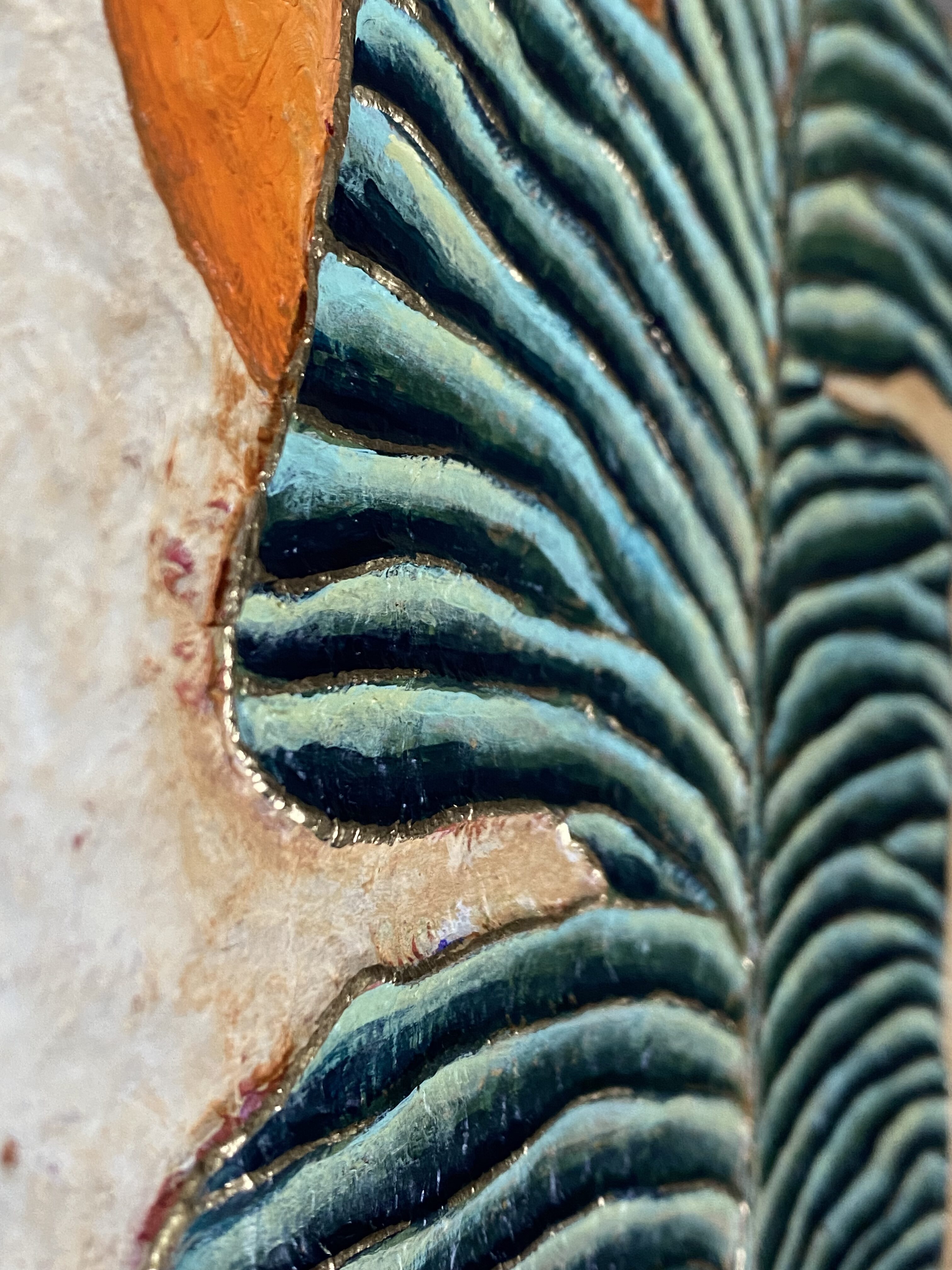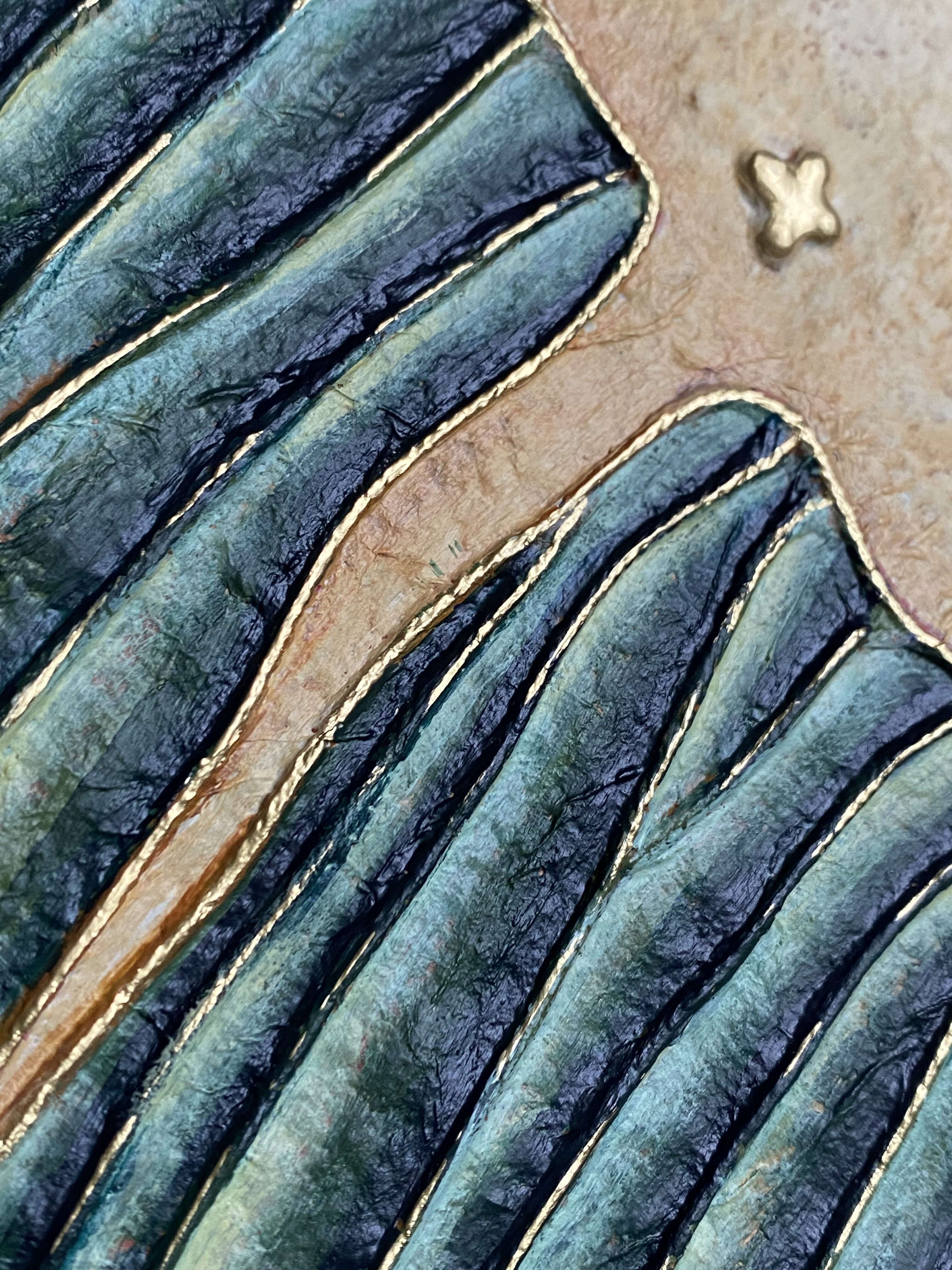 Technique : Techniques mixtes sur MDF, pâte à papier, ficelle marouflée, peinture acrylique, dorures.