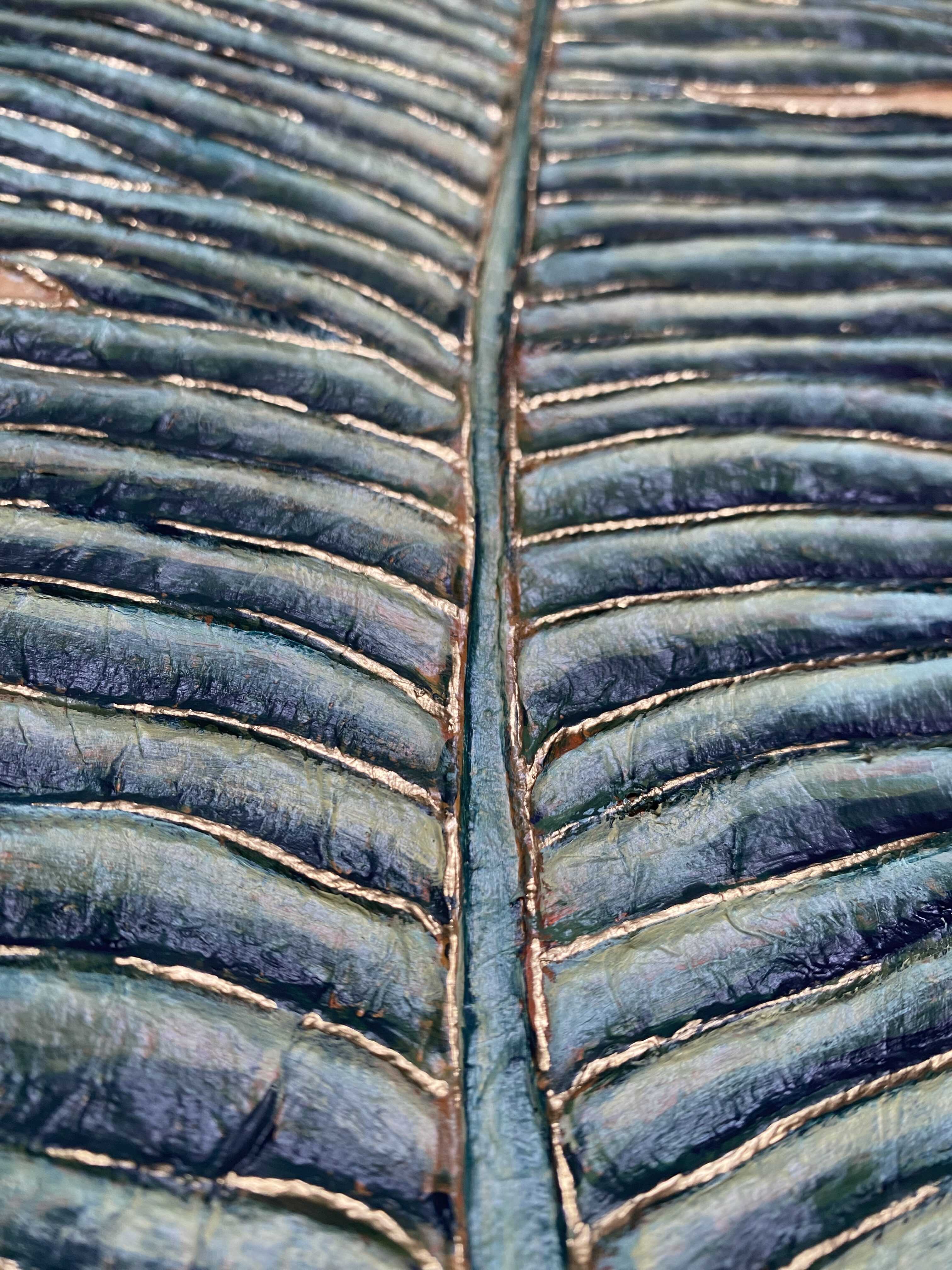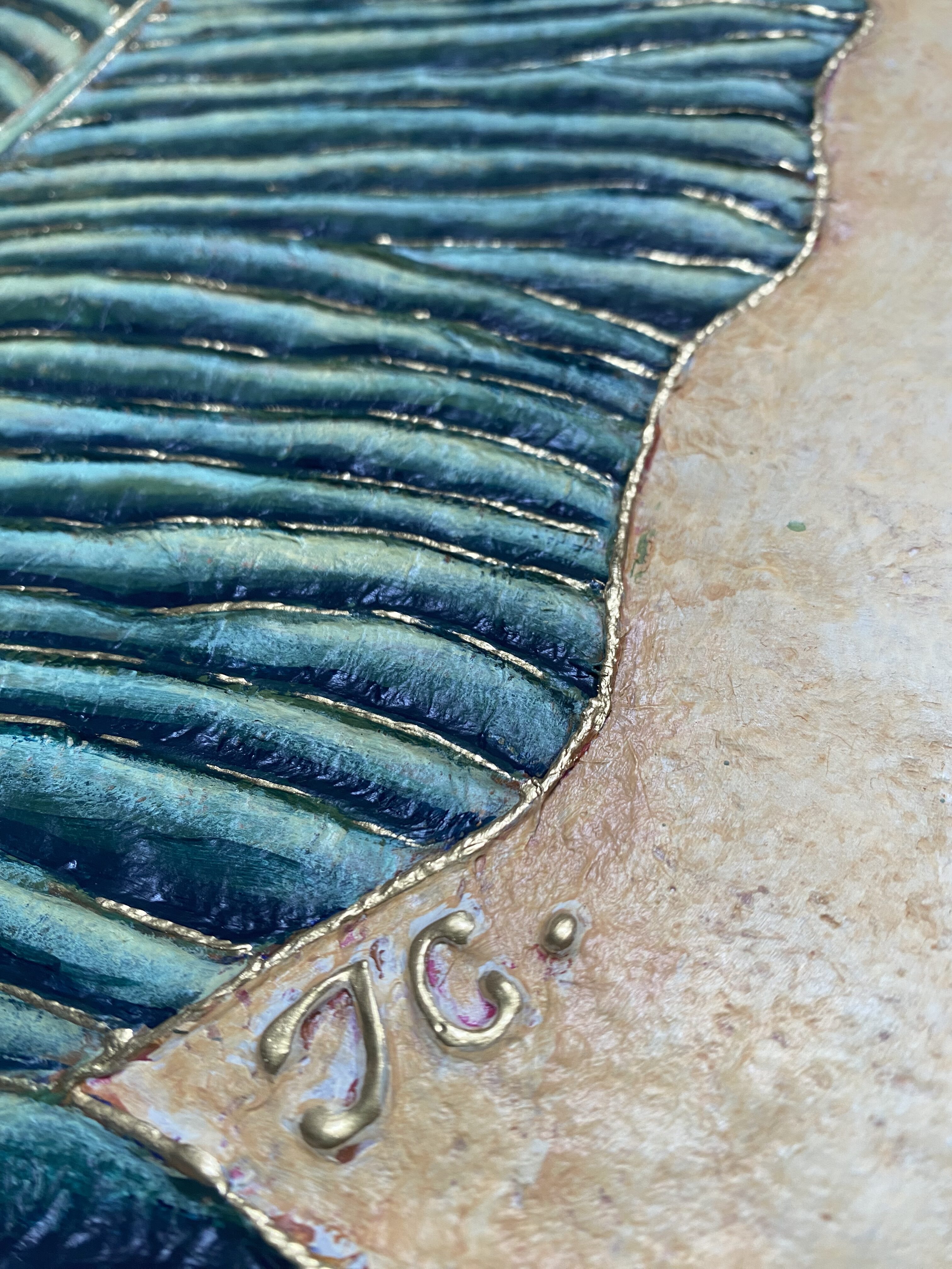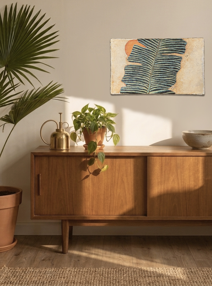 Sur ce format horizontal de 45 x 30 cm, le support en MDF accueille un bas-relief qui détaille les nervures de la feuille. Le Tableau « Feuille de palmier devant le soleil » joue sur les nuances de verts de la feuille. Le soleil orange vibrant illumine le fond beige texturé, tandis que des touches d’or viennent souligner les nervures du feuillage.