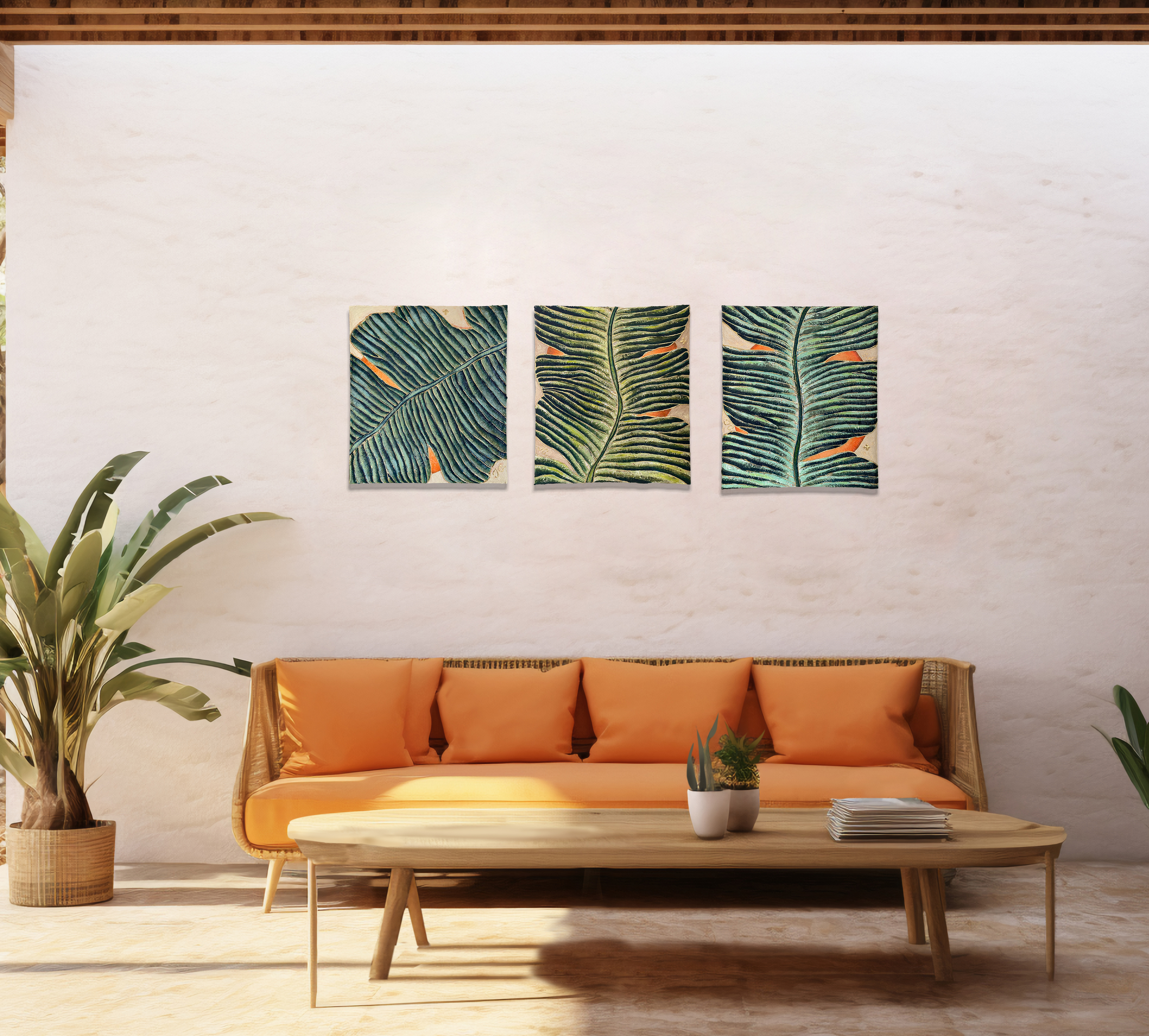 Une œuvre vitaminée et solaire qui invite la nature sauvage dans votre intérieur. Pour découvrir comment ces déclinaisons s’assemblent, je vous invite à parcourir ma boutique en ligne ou à me suivre sur Instagram pour observer les jeux de lumière sur les textures.