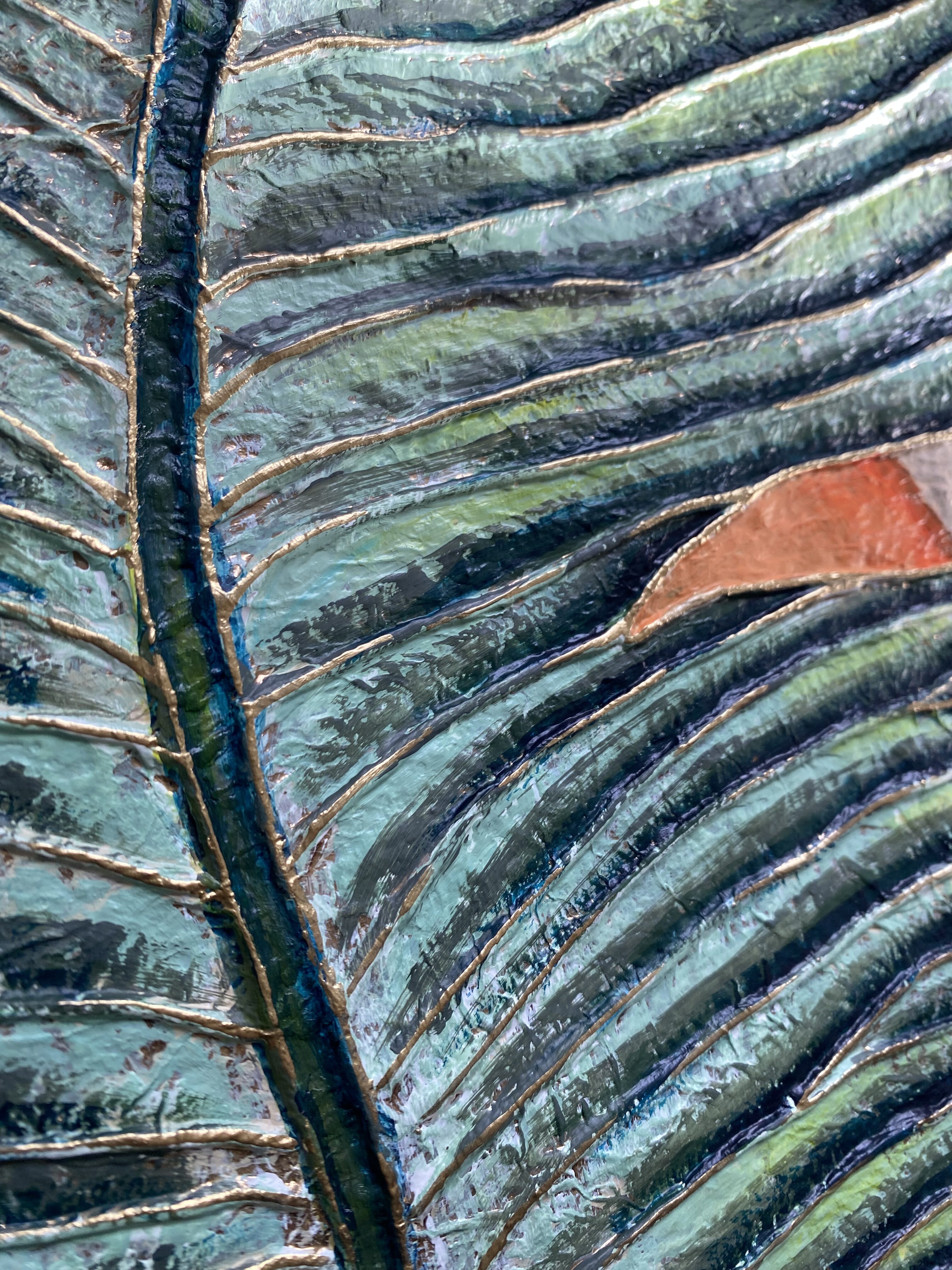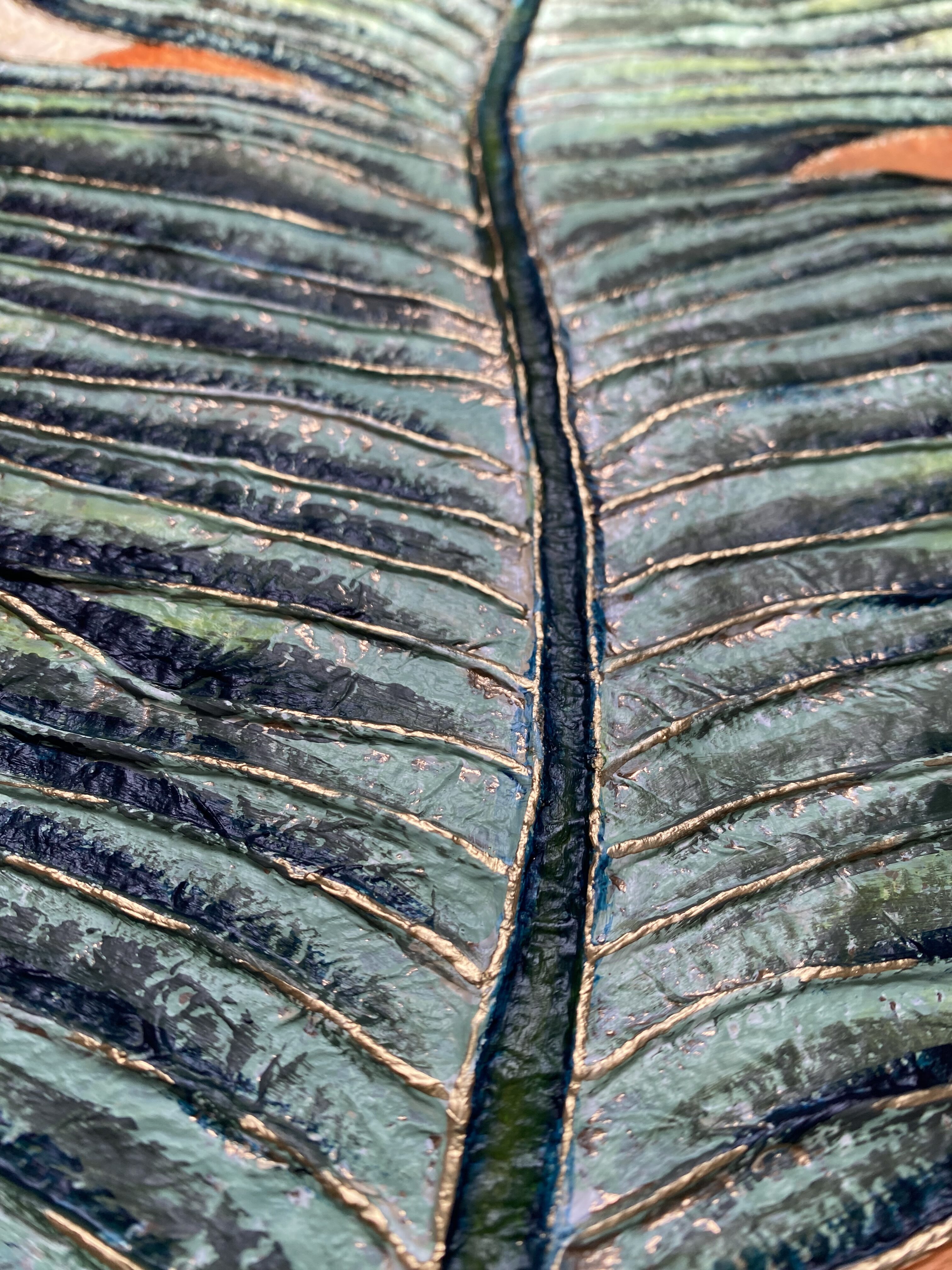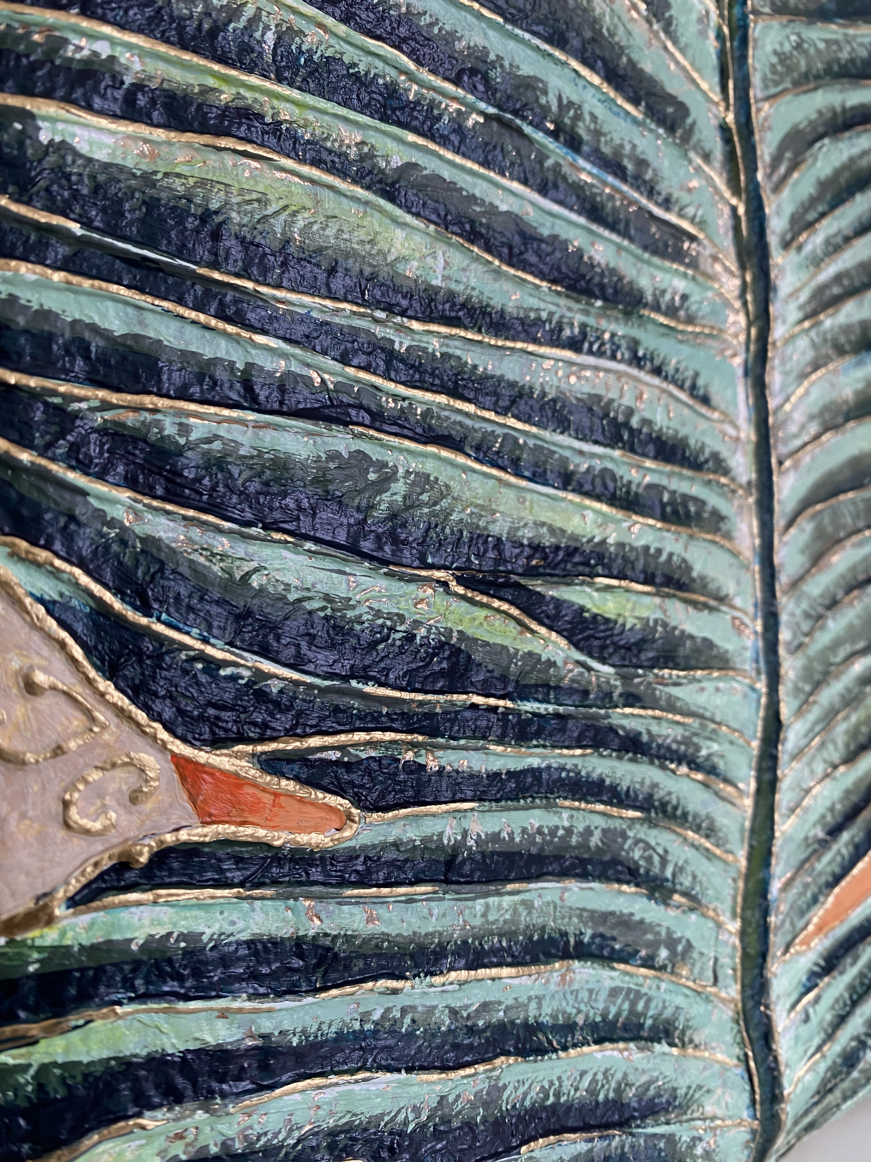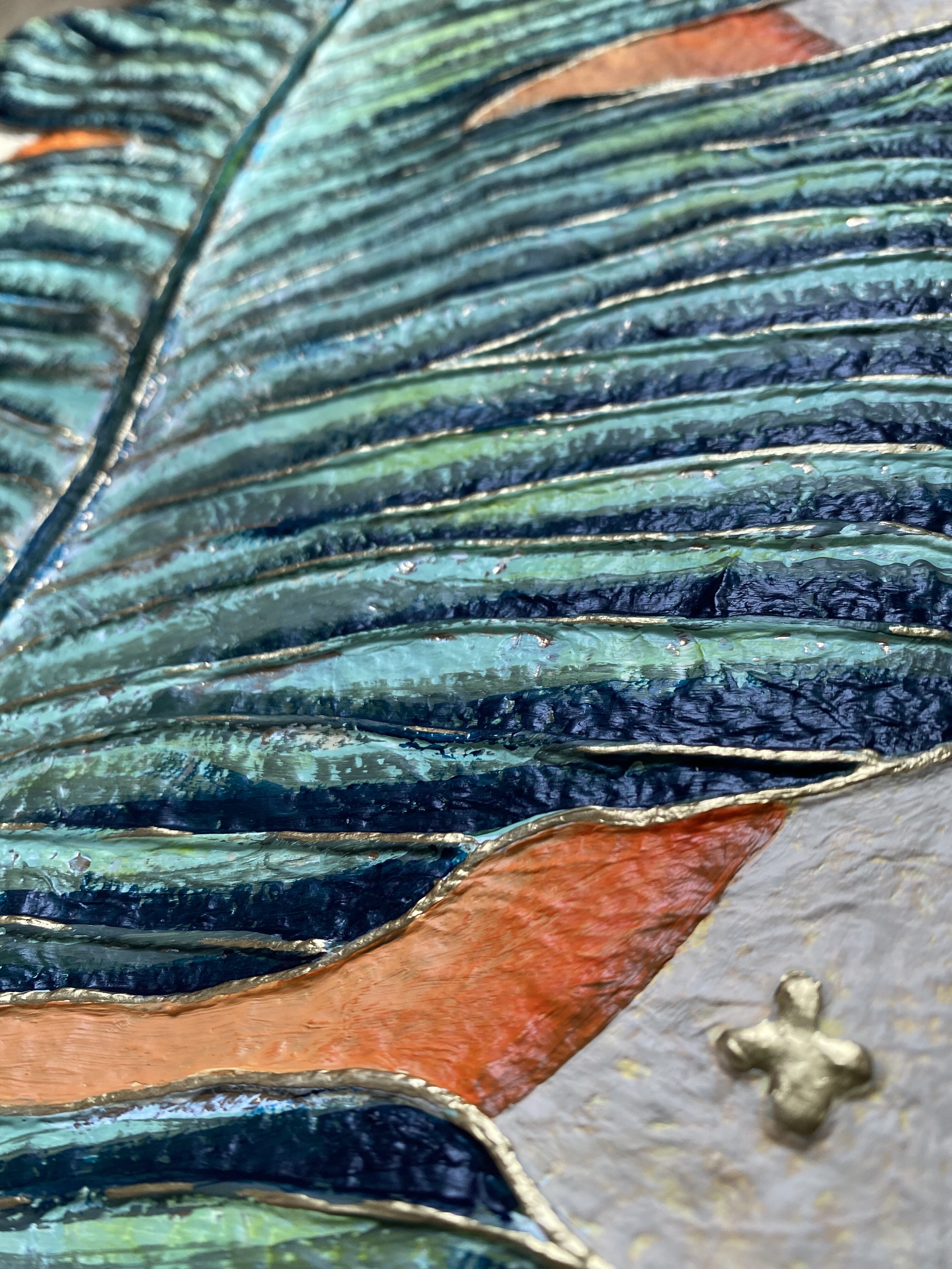 Pour ce format de 34 x 29 cm, j’ai voulu que la feuille semble vibrer devant ce soleil orange. Le Tableau « Feuille devant le soleil #2 » mélange la ficelle marouflée et la pâte à papier pour créer des nervures que l’on peut vraiment toucher. Les petites touches de dorure à l’encre sont là pour rappeler l’éclat du soleil qui traverse le feuillage.