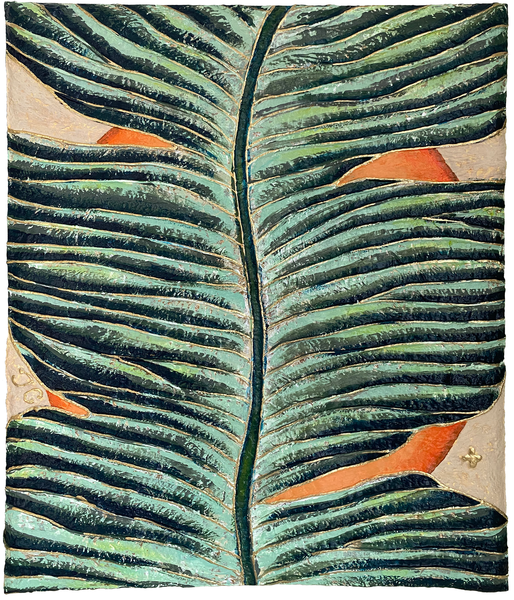 Cette déclinaison est la suite logique de mon travail sur le végétal. Avec le Tableau « Feuille devant le soleil #2 », je continue d’explorer ce face-à-face entre l’orange du soleil et le vert des feuilles. En reprenant ce sujet, mon but est de montrer comment une simple nervure peut changer toute la dynamique du relief et capter la lumière différemment.