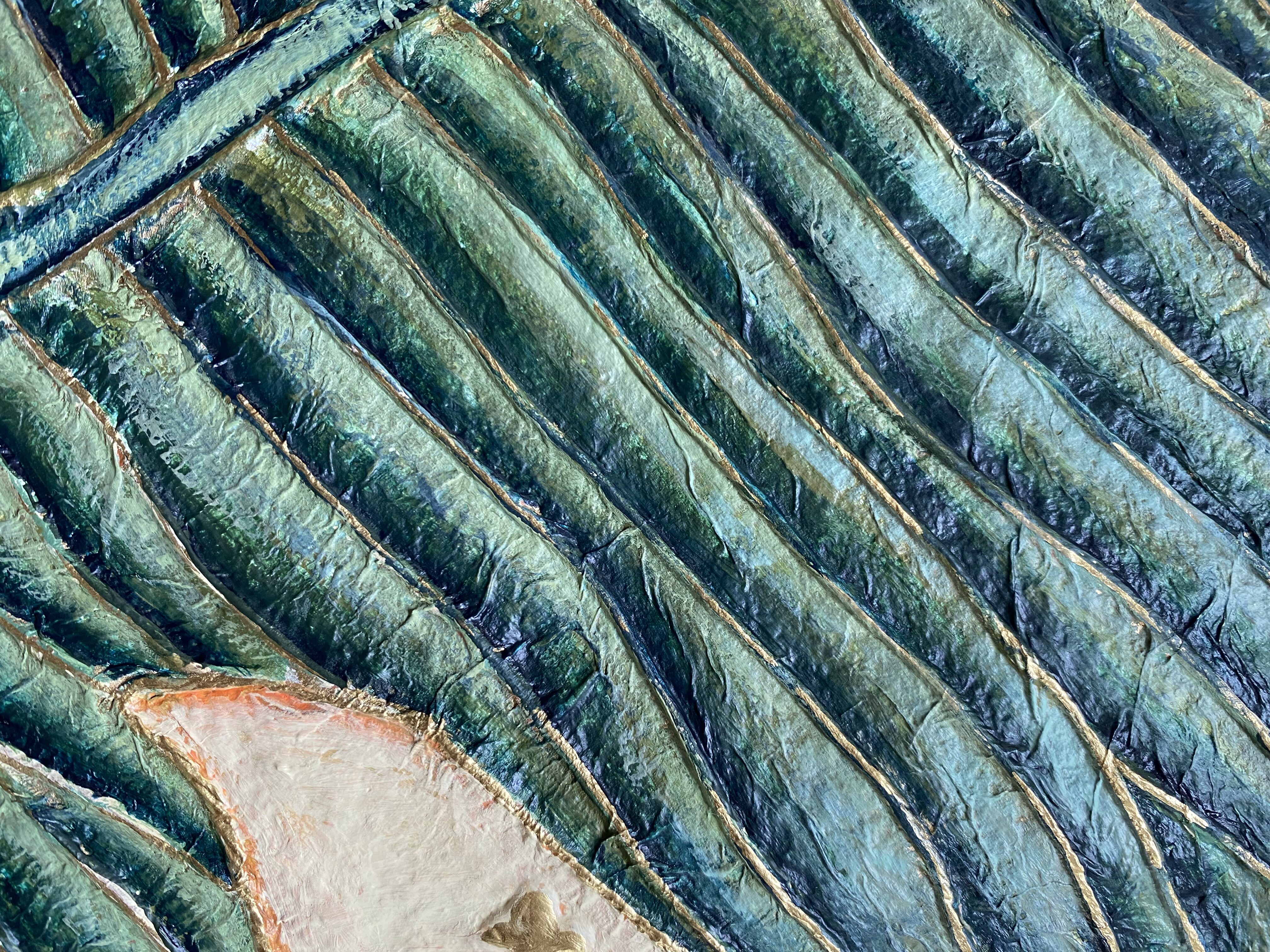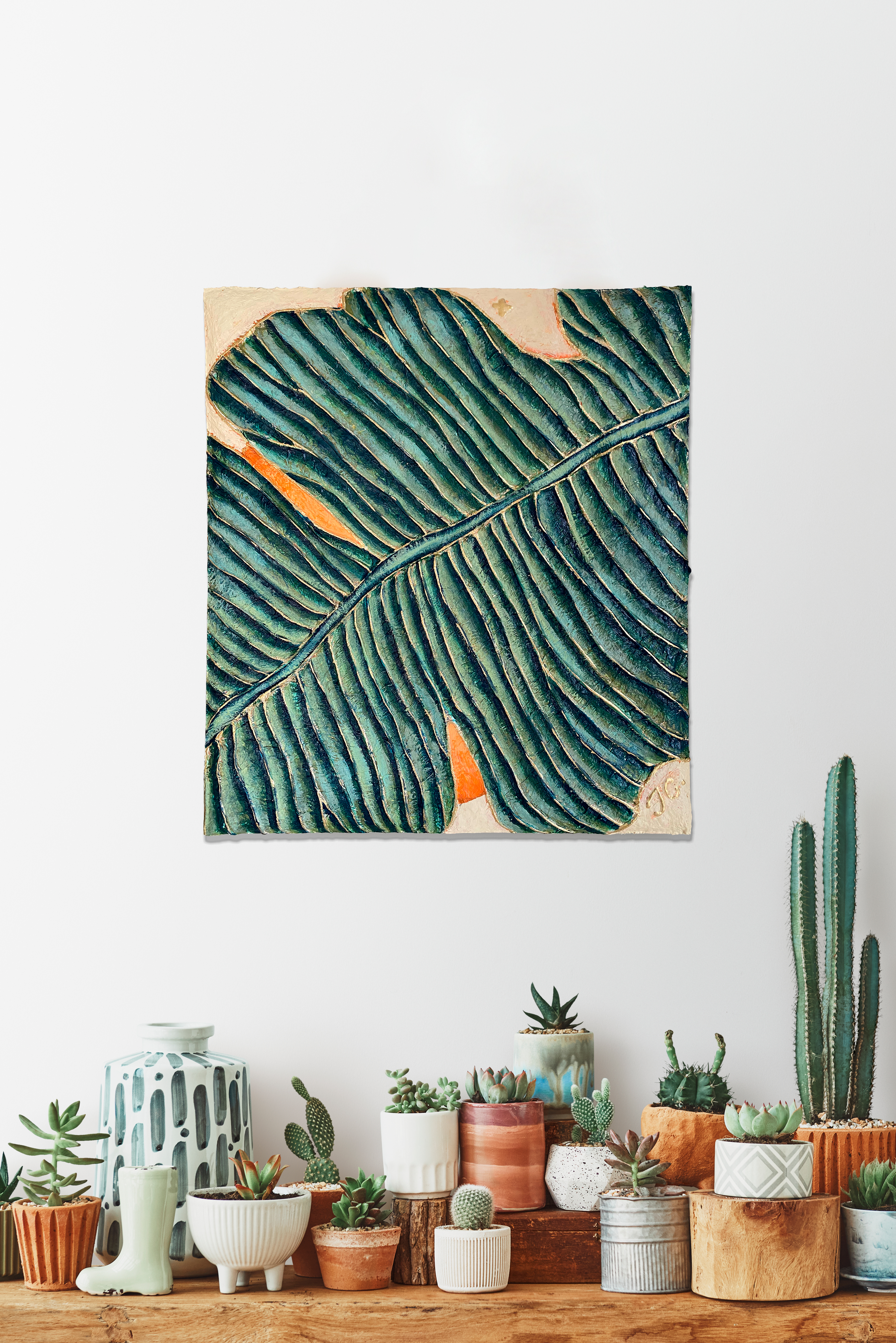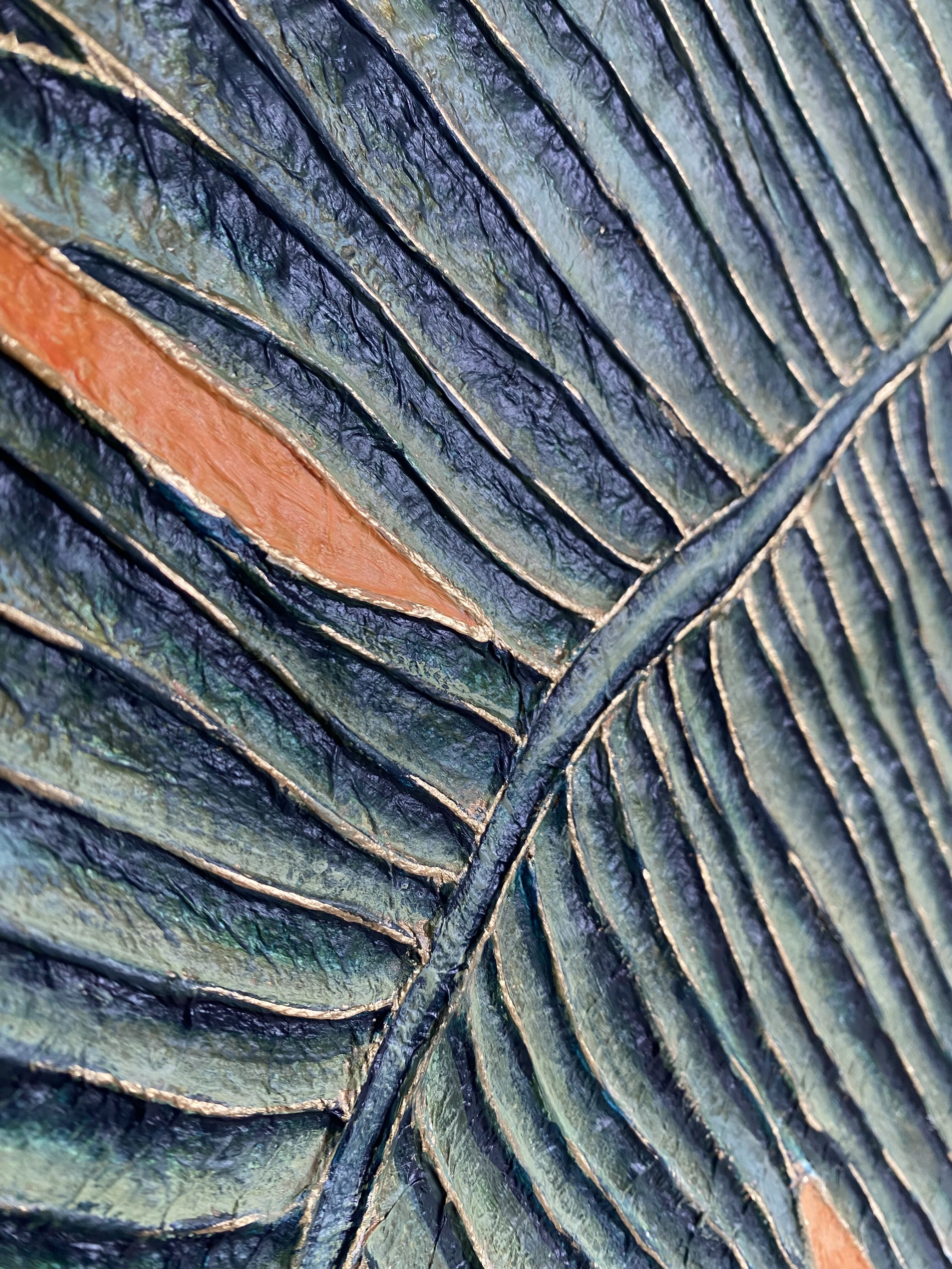 Avec le Tableau « Feuille devant le soleil #3 », je poursuis ma recherche sur le mouvement des feuilles tropicales. Cette déclinaison est née de l’envie de jouer encore une fois avec les contrastes : celui du vert végétal contre l’orange du soleil, mais aussi celui de la matière brute contre la finesse des dorures.