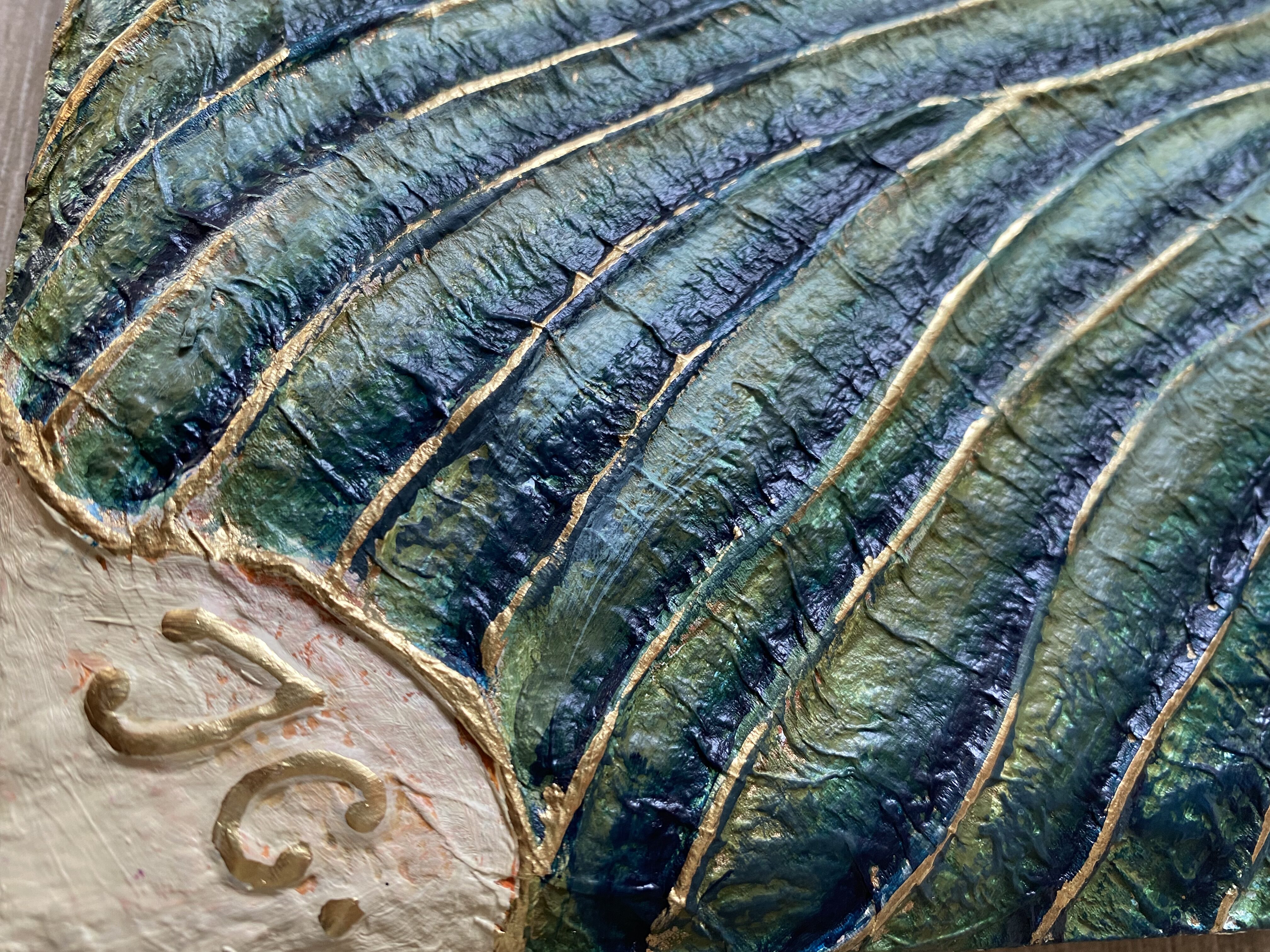 Technique : Techniques mixtes sur MDF, pâte à papier, ficelle marouflée, peinture acrylique, dorures.