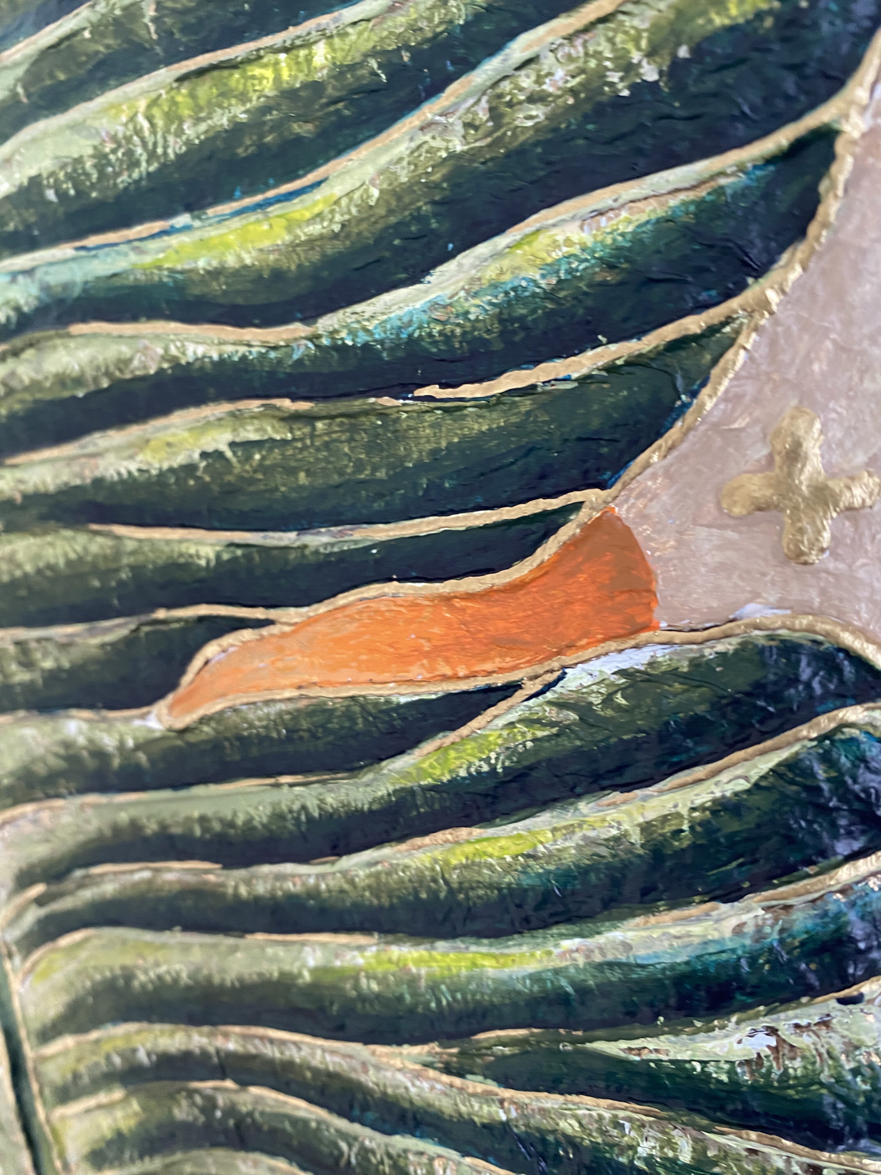 Palette : Verts, orange éclatant, beige et reflets dorés.