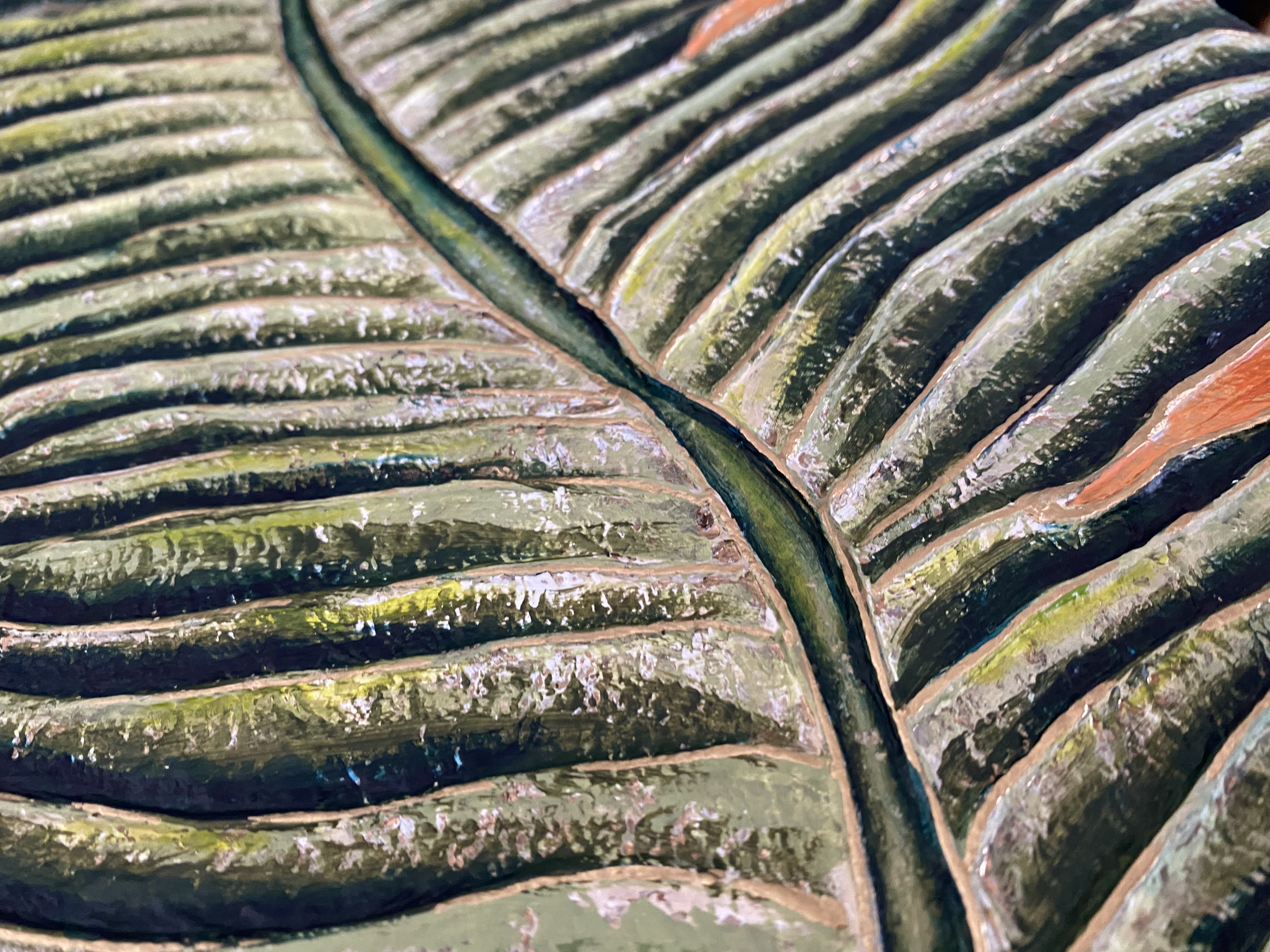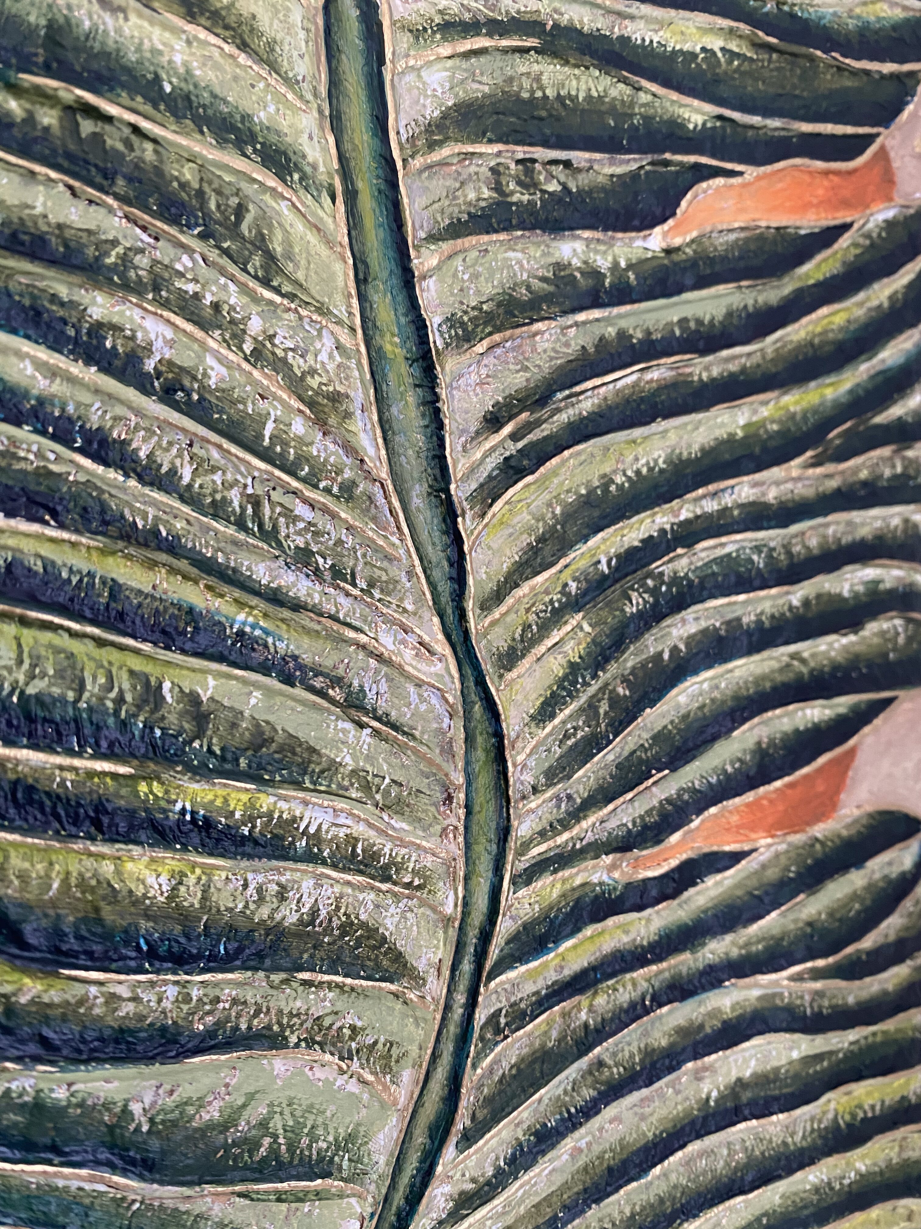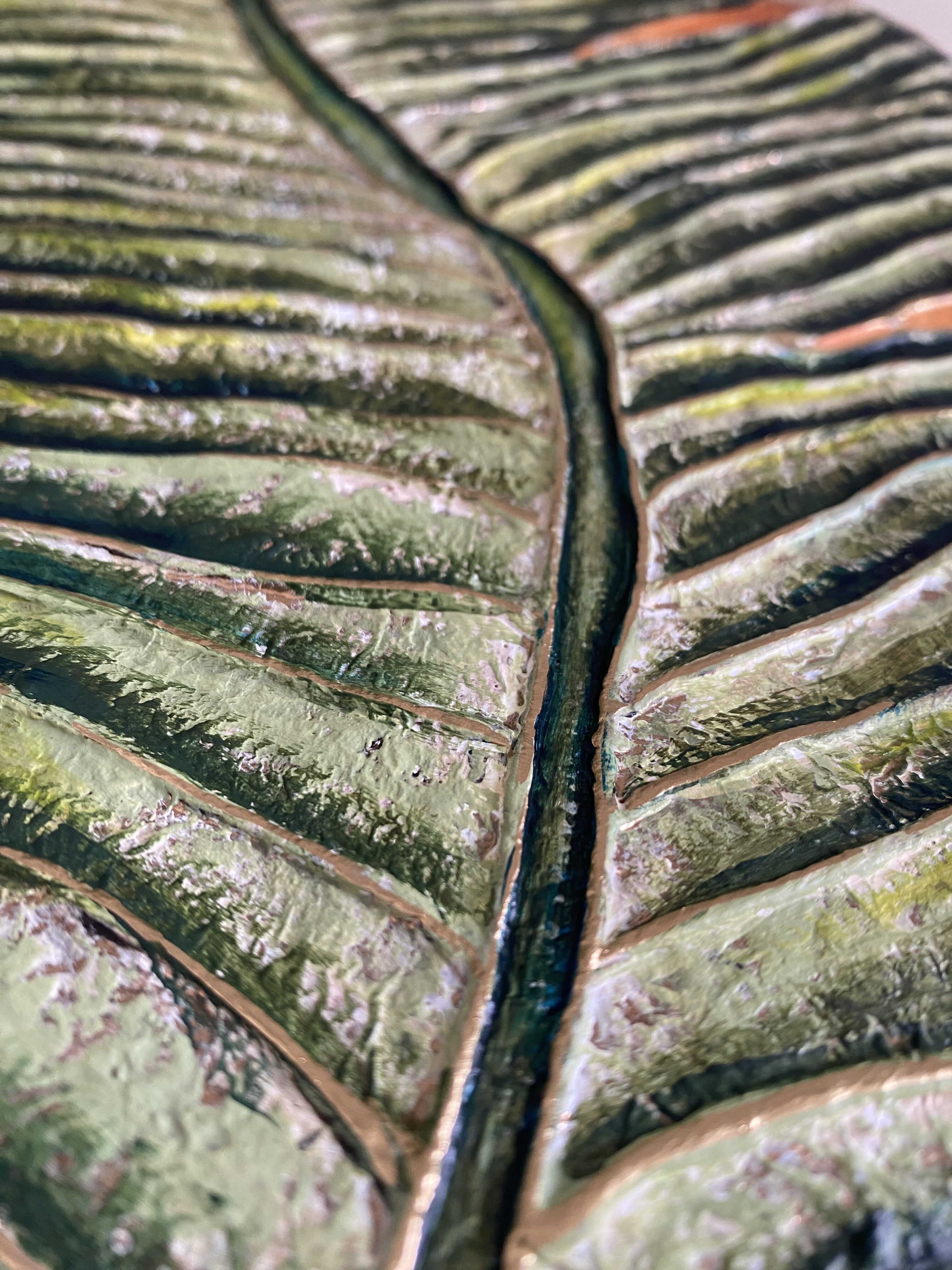 Le Tableau « Feuille devant le soleil #4 » vient clore cette série de quatre déclinaisons. Mon intention ici était de figer un dernier instant de cette rencontre entre le feuillage et la lumière. Chaque pièce de cette série est unique car le relief de la feuille ne se place jamais de la même manière, créant à chaque fois un nouveau jeu d’ombres et de reliefs.