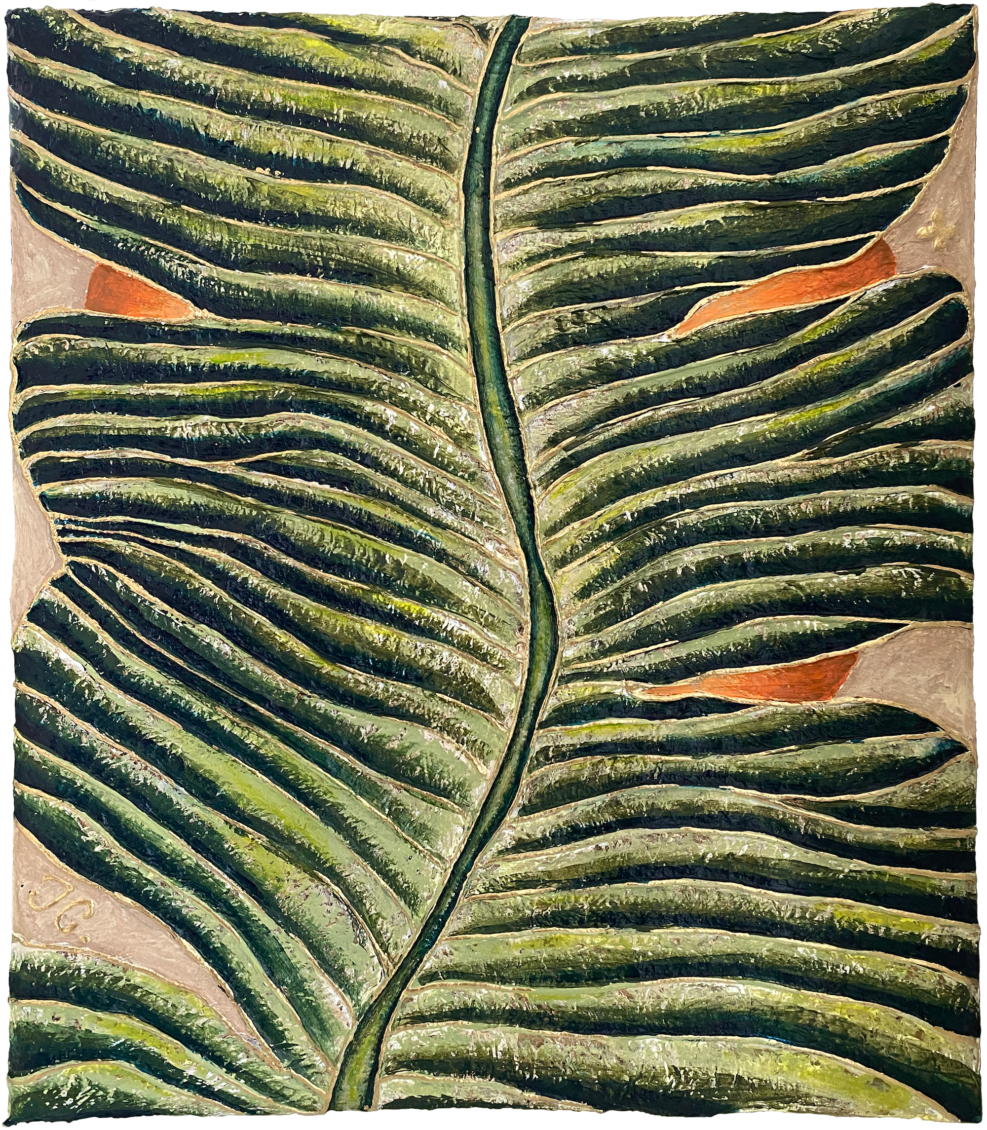 Pour ce dernier format de 33,5 x 29 cm, j’ai voulu un rendu très vitaminé. Le Tableau « Feuille devant le soleil #4 » met en avant des nervures bien marquées grâce à la ficelle marouflée, soulignées par des pointes de dorure à l’encre. Le contraste entre le vert et l’orange du soleil donne une vraie énergie à l’ensemble. C’est une pièce qui fonctionne très bien seule en duo ou trio avec une autre ou plus de la série.