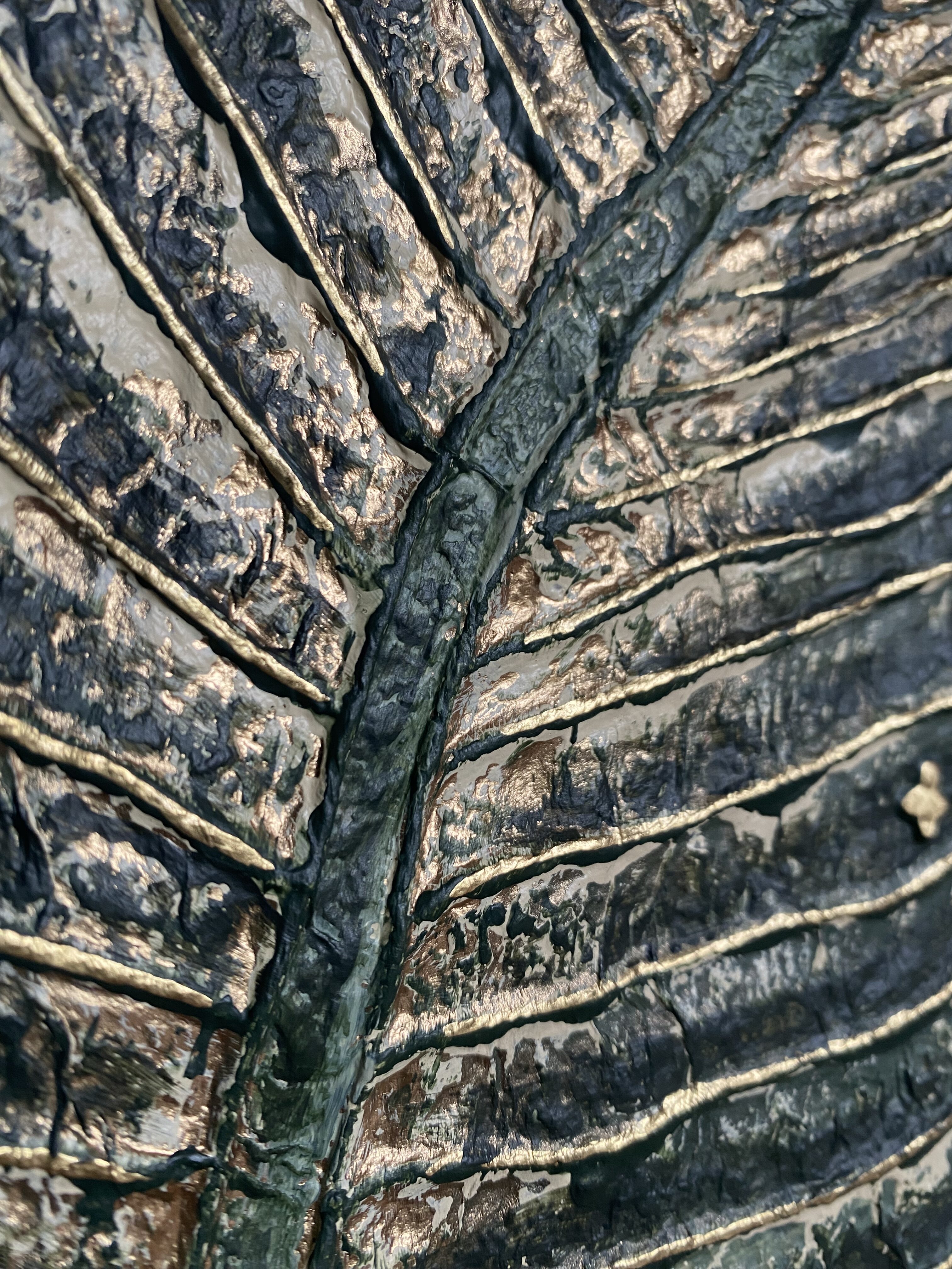 Dans ce format vertical de 23,5 x 14 cm, j’ai exploré les lignes des nervures d’une feuille en plan macro. Le Tableau « Feuille verte, nervures or » est travaillé en bas-relief très texturé. Les nervures sont soulignées par une dorure qui vient contraster avec le vert foncé profond.