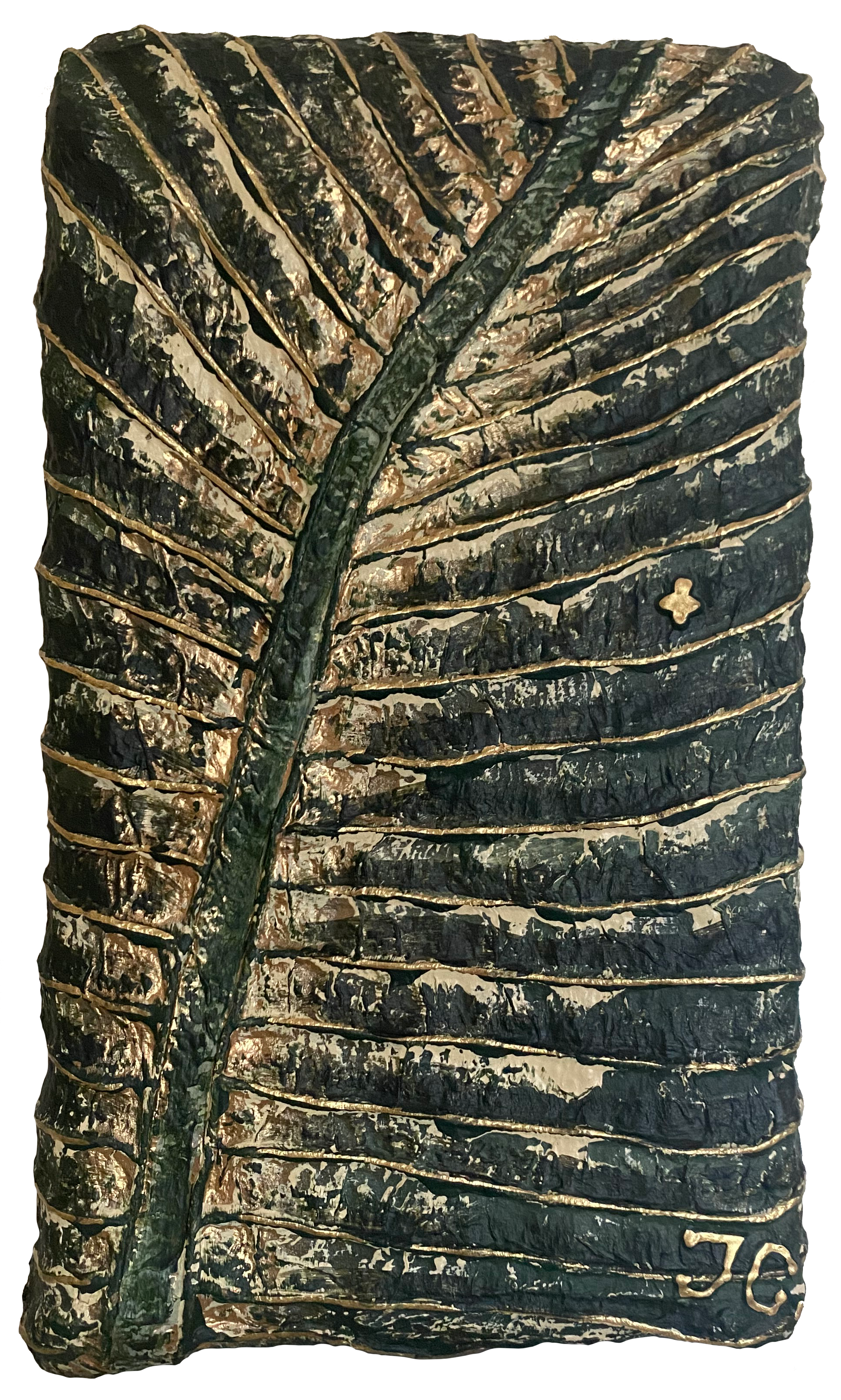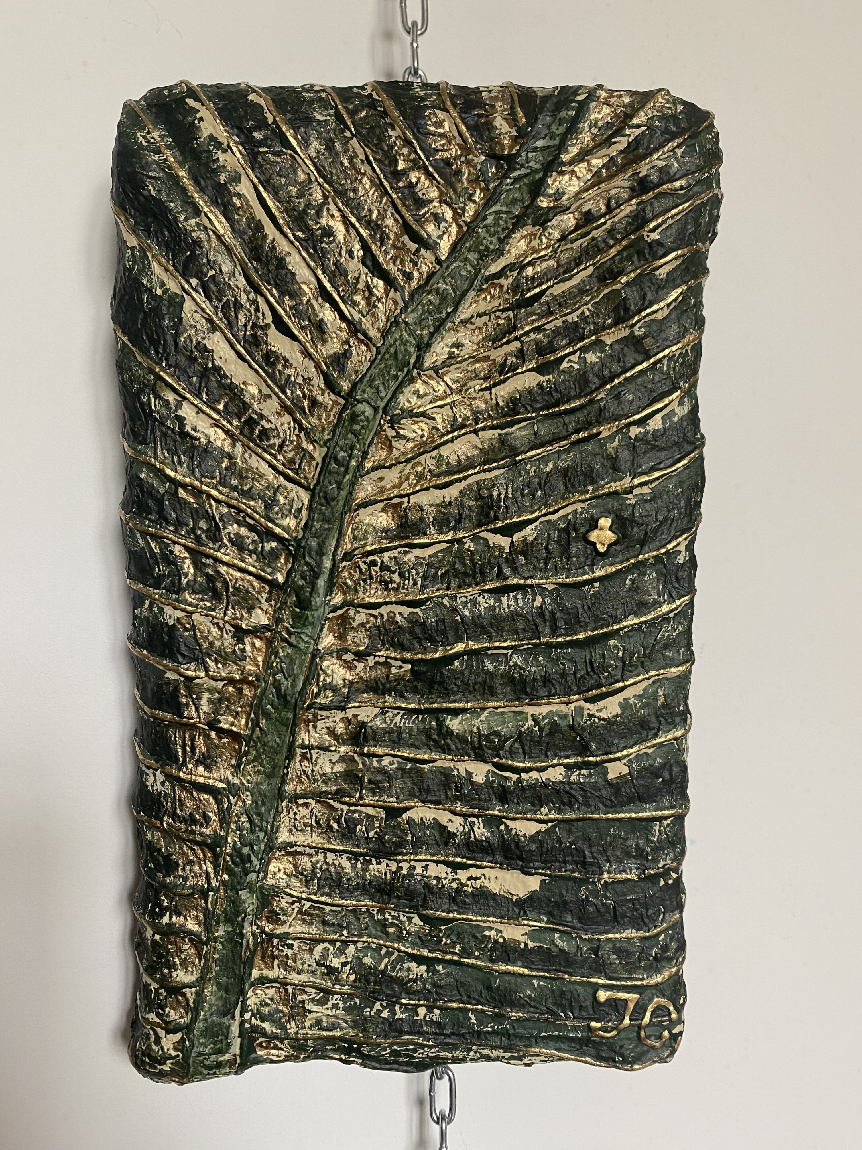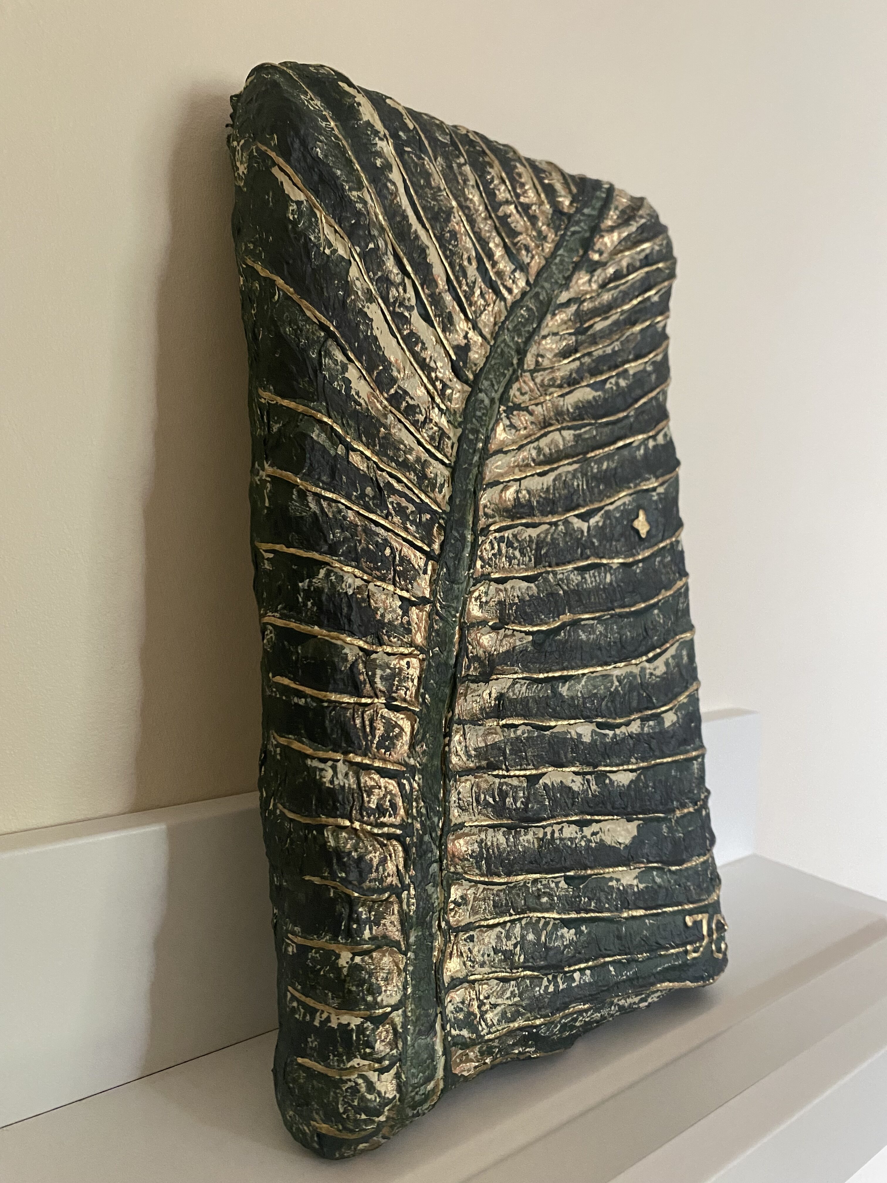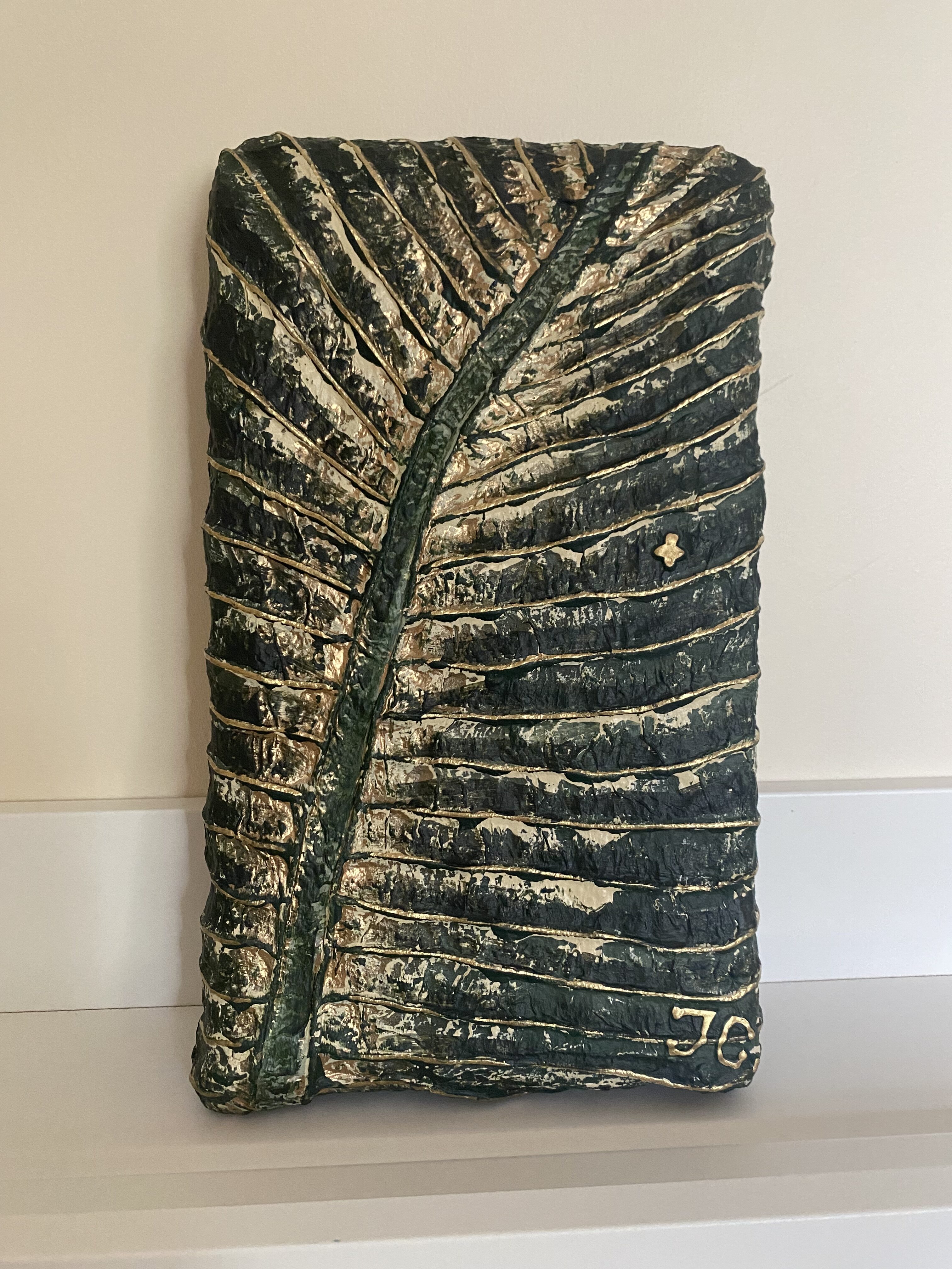 Le Tableau « Feuille verte, nervures or » est une œuvre qui révèle la structure intime du végétal. Une particularité de cette pièce réside dans son support : un support rigide et irrégulier que j’ai moi-même façonné à partir de carton et pâte à papier recyclée. Cette base rugueuse apporte une profondeur unique à la composition, faisant de chaque centimètre carré une expérience tactile.