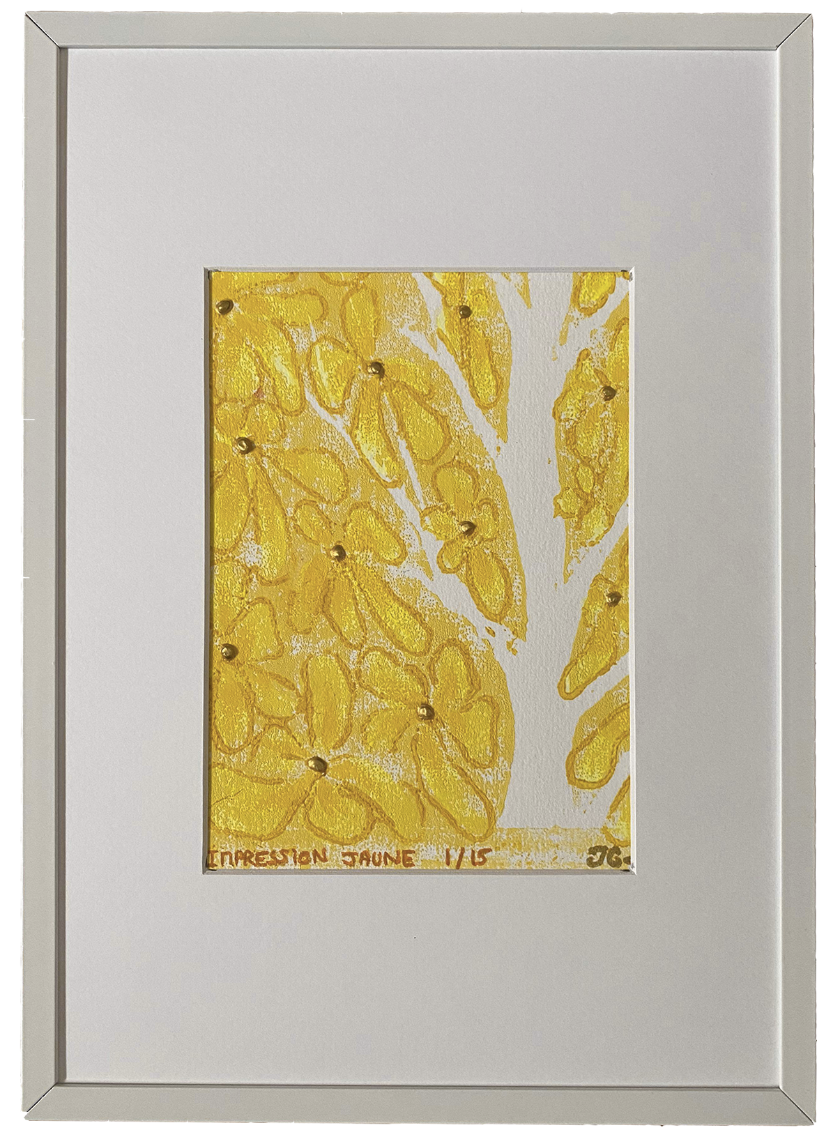 Impression jaune est une estampe de gravure encrée et imprimée à la main par l’artiste plasticienne Tiphanie Canada. Réalisée en 2023, il s’agit d’une édition très limitée car l’artiste n’a imprimé manuellement que 15 exemplaires. Des détails acryliques en bas relief sont apposés sur chaque estampe, un clin d’oeil aux bas-reliefs de l’artiste.