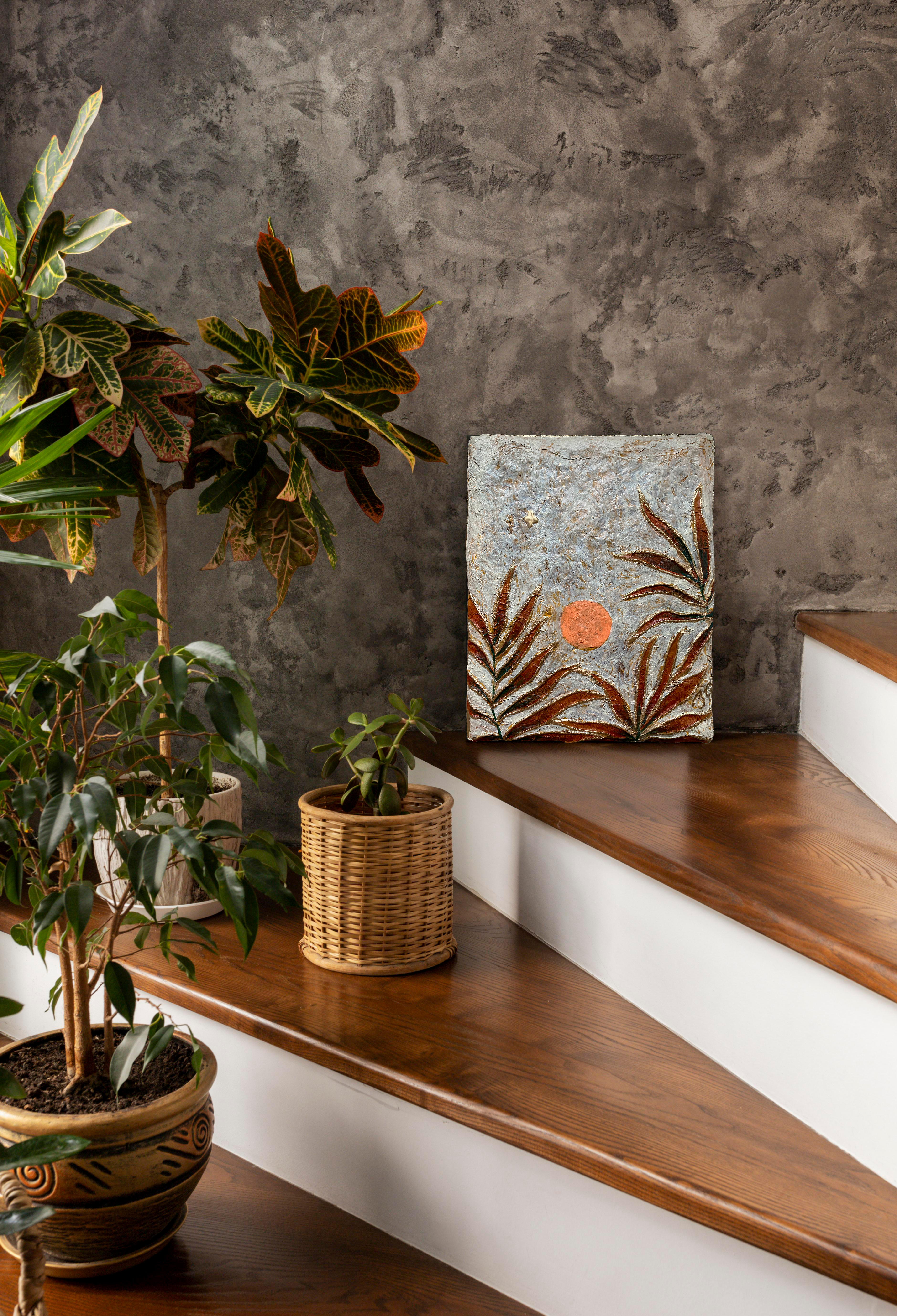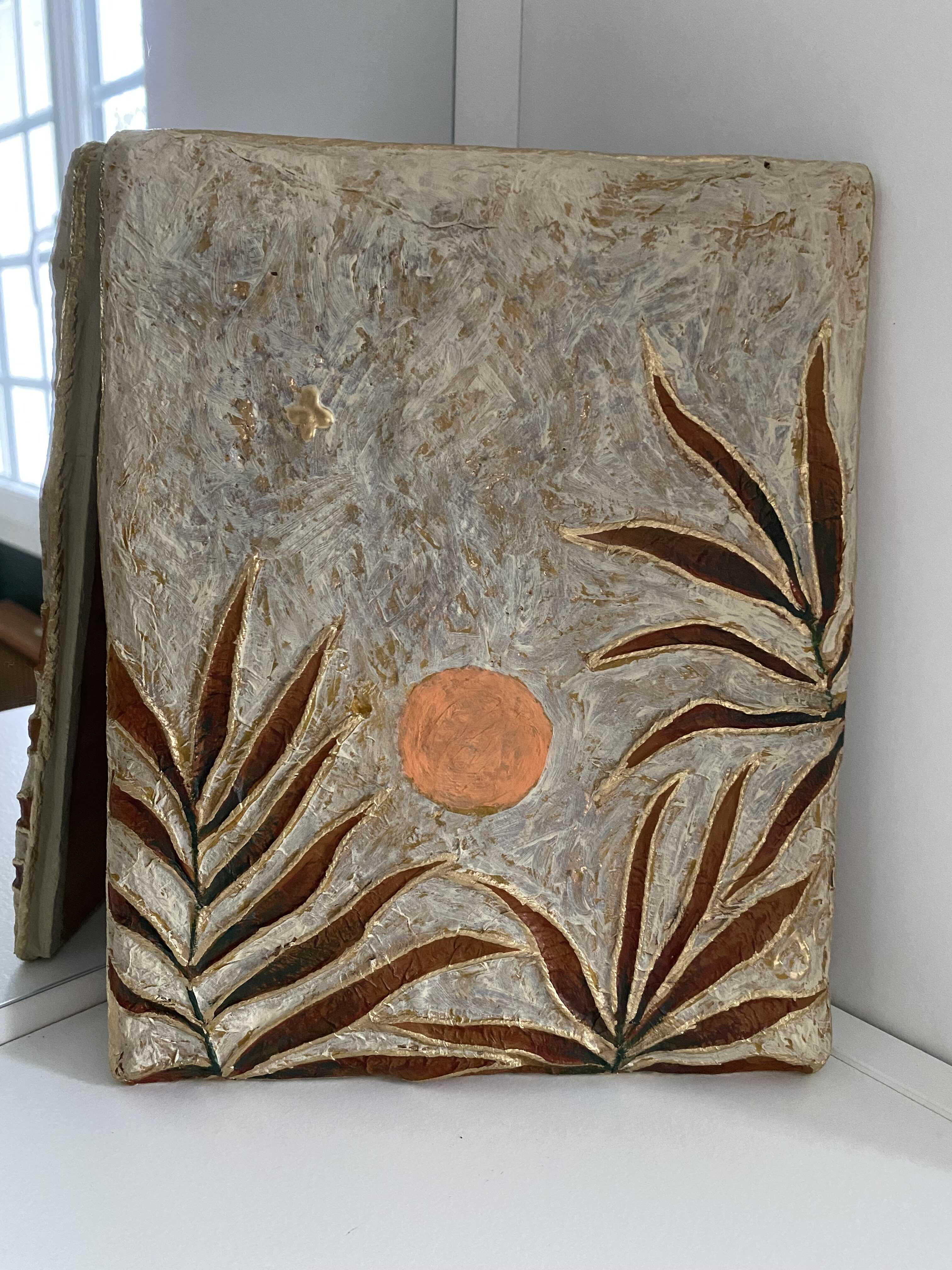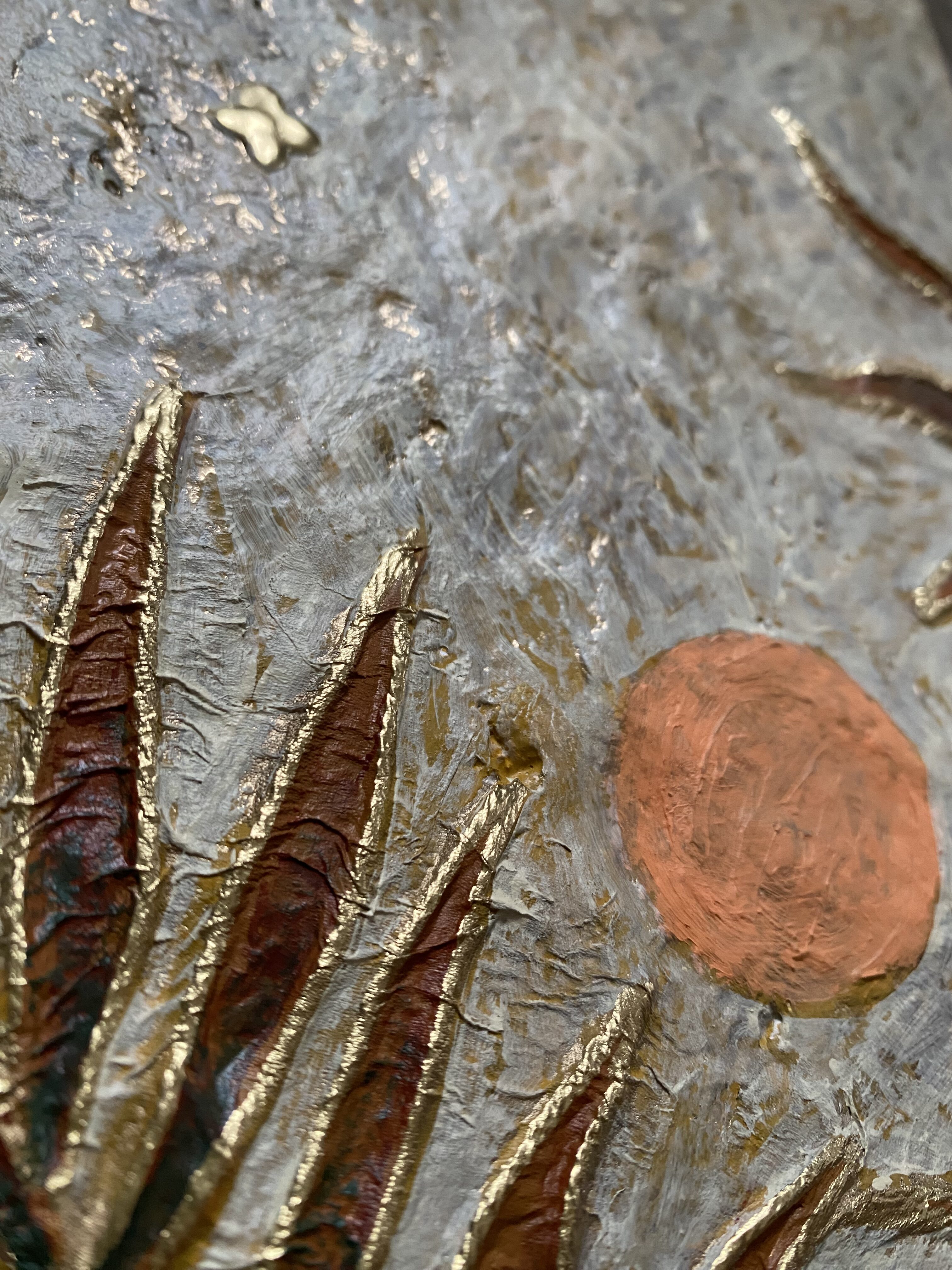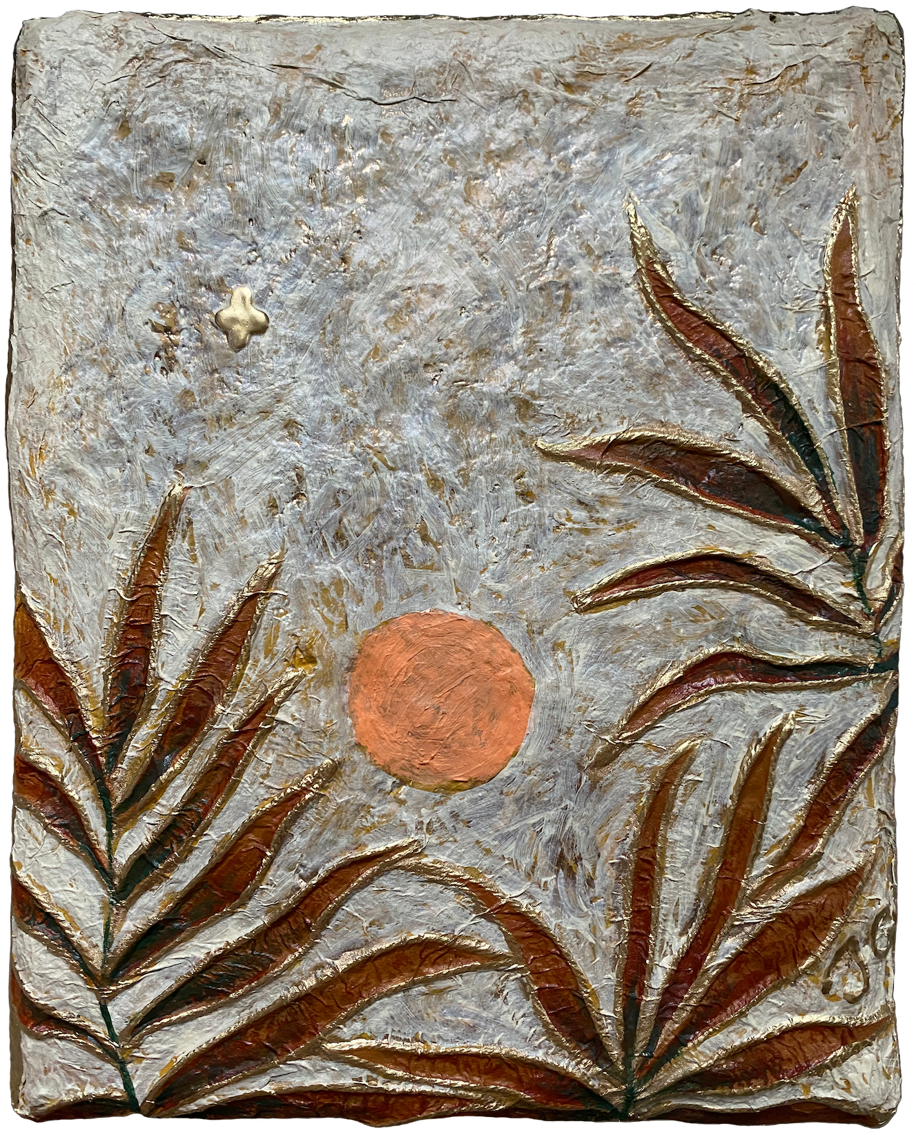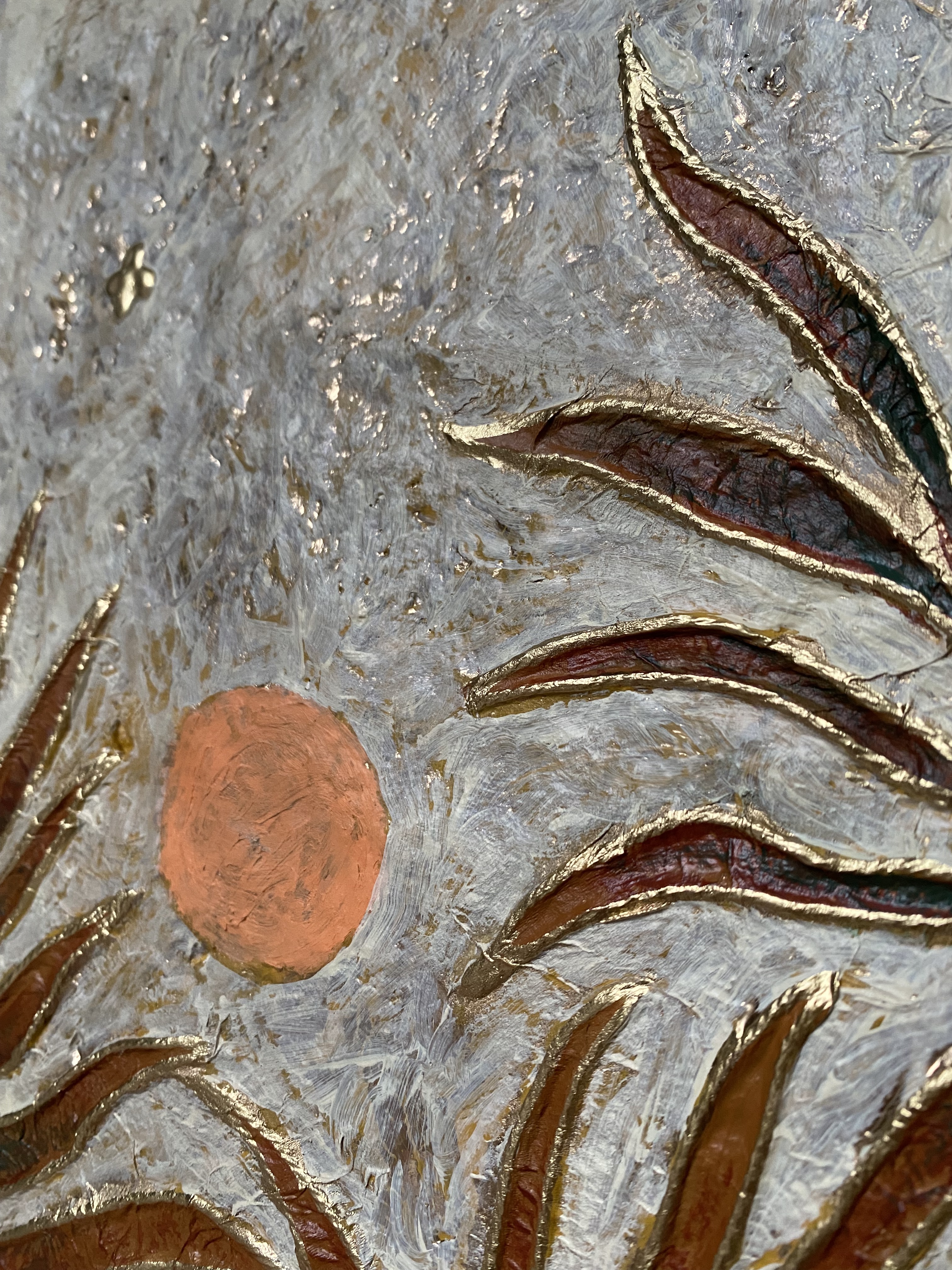 Dans ce format vertical de 24 x 19 cm, le Tableau « Un soir d’été » met en scène un feuillage tropical dont on imagine le mouvement. Le choix du brun pour les feuilles crée un contraste avec le soleil orange vibrant qui domine l’arrière-plan. Le travail de la pâte à papier et de la ficelle marouflée sur bois donne une épaisseur tactile à l’œuvre, tandis que les dorures à l’encre viennent souligner les derniers reflets du jour.