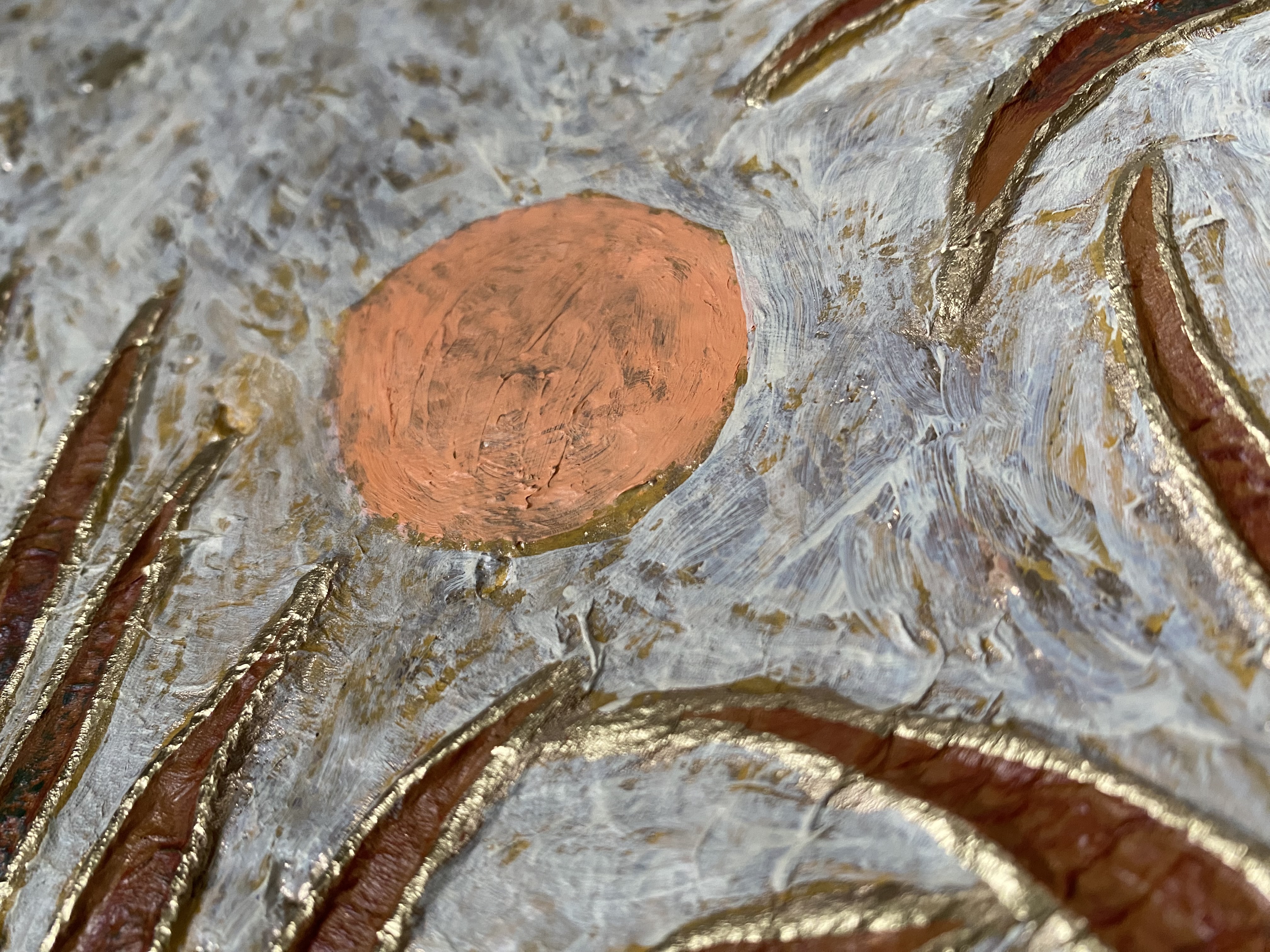 Technique : Techniques mixtes sur bois, pâte à papier, ficelle marouflée, peinture acrylique, dorures.