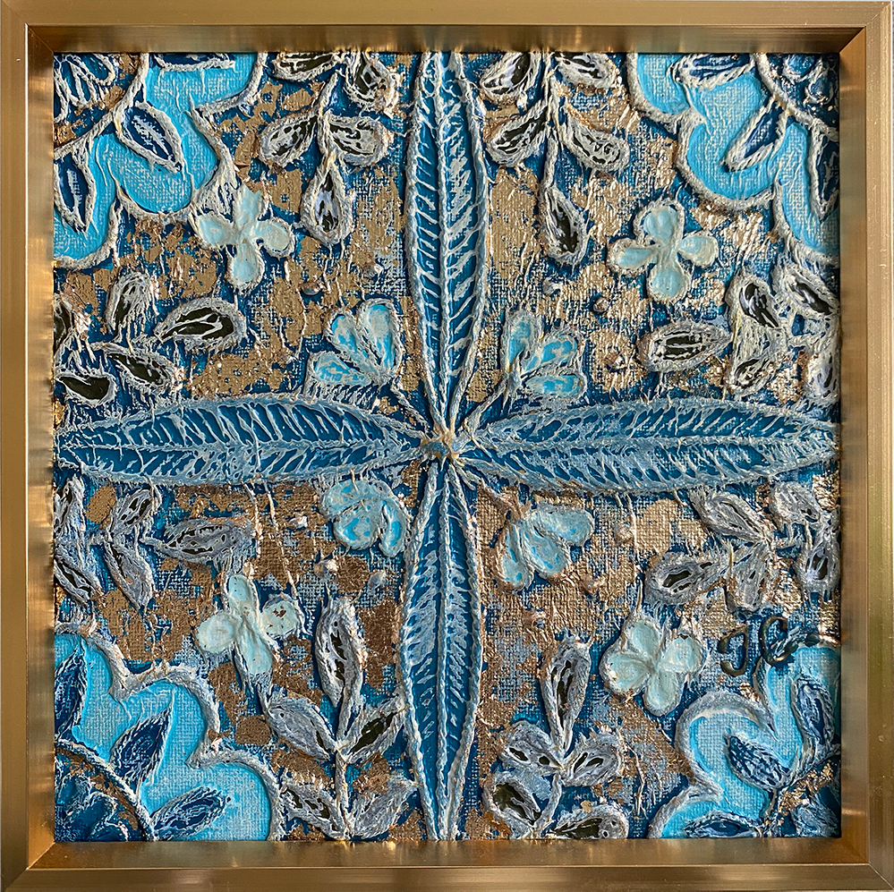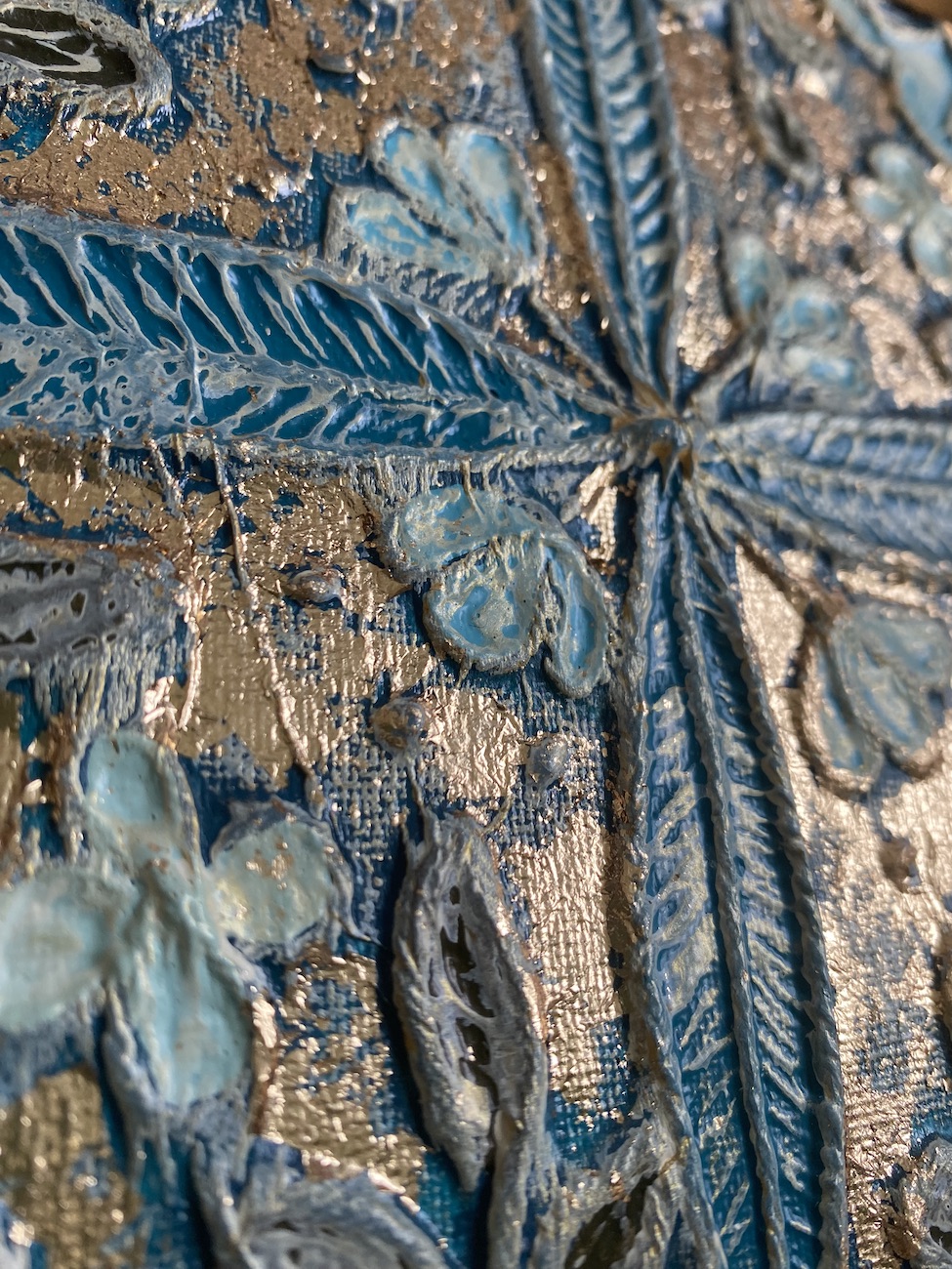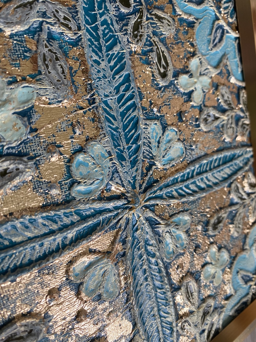 Technique(s) : mixtes (pâte à papier, collage, peinture acrylique, feuille d’or, encre)